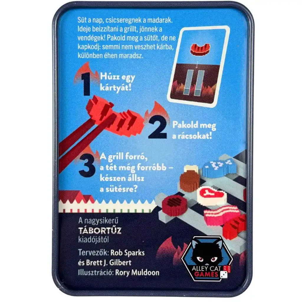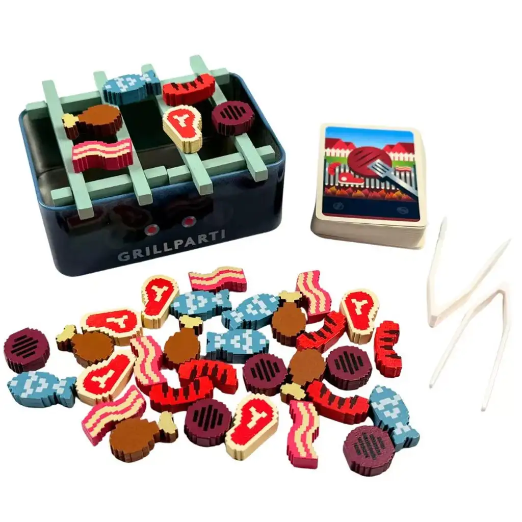 Cutia conține multe piese de mâncare din lemn, detaliate cu grijă: fripturi, bacon, pește, cârnați și copănele de pui – toate în stil retro pixel-art. Mecanica de joc este foarte rapidă, fiecare tură poate dura între 3 și 15 minute, ceea ce îl face o alegere ideală pentru seri scurte de joc sau chiar pentru călătorii. Cutia metalică compactă este rezistentă și ușor de transportat, astfel încât este mereu la îndemână pentru un grătar spontan oriunde ați fi.