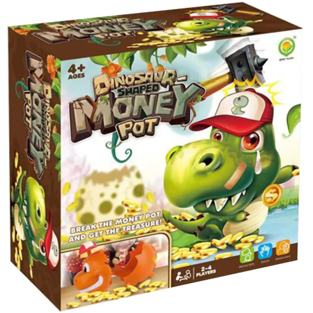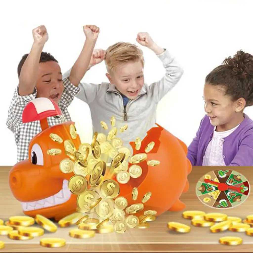 Adună banii în pușculița dinozaur, sparge-o și obține toate monedele de aur! Acest joc de societate super distractiv oferă distracție palpitantă pentru până la patru jucători, iar copilul tău poate juca împreună cu ceilalți membri ai familiei sau cu prietenii și poate colecta monedele de aur. Regulile jocului sunt extrem de simple, jucătorii trebuie să rotească pe rând și să îndeplinească sarcina indicată. Pentru a sparge pușculița dinozaur, setul de joc include și un ciocan de plastic.