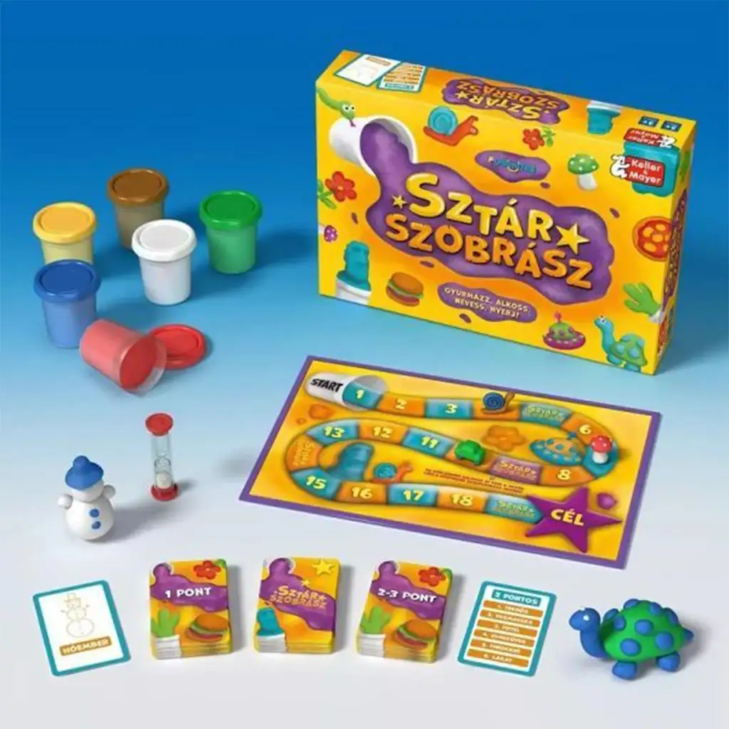 În jocul de societate Sztárszobrász, întreaga familie poate participa la o provocare de modelare cu plastilină cu adevărat creativă și distractivă! În timpul jocului, trebuie să modelați din plastilină diverse obiecte, persoane sau chiar animale, pe care le trageți pe baza cărților. Există posibilitatea de a juca în echipă sau individual, în timp ce concurați și contra timpului. Este perfect pentru cei mici, deoarece sarcinile pot fi înțelese fără a ști să citească, dar provocări mai serioase așteaptă și pe cei mai mari și pe adulți. Jocul încântă cu ajutorul plastilinei colorate și garantează multe momente de râs și creativitate. Diversitatea cărților de sarcini asigură că veți întâlni mereu noi provocări, astfel încât nu va deveni niciodată plictisitor. Fie că cauți un joc pentru o petrecere de neuitat, fie că vrei să înveselești o după-amiază în familie, Sztárszobrász va fi cu siguranță o alegere excelentă.