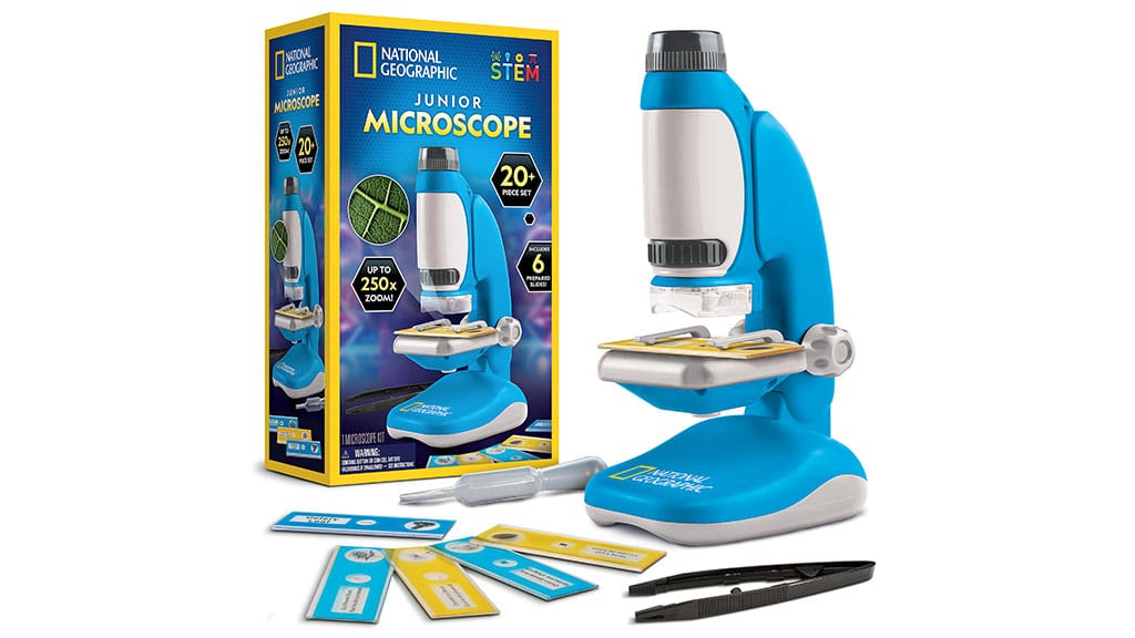 Acest microscop cu o mărire de 250 de ori, cu iluminare superioară și inferioară, precum și cu un ocular detașabil. Copiii pot colecta propriile probe sau pot folosi cele șase secțiuni vegetale pregătite dinainte pentru a examina îndeaproape, de exemplu, polenul de pin, semințele de păpădie și multe alte lucruri interesante. Acest microscop este un instrument ideal pentru descoperirea naturii și dezvoltarea curiozității științifice, în timp ce copiii pot învăța într-un mod jucăuș despre minunile lumii microscopice.