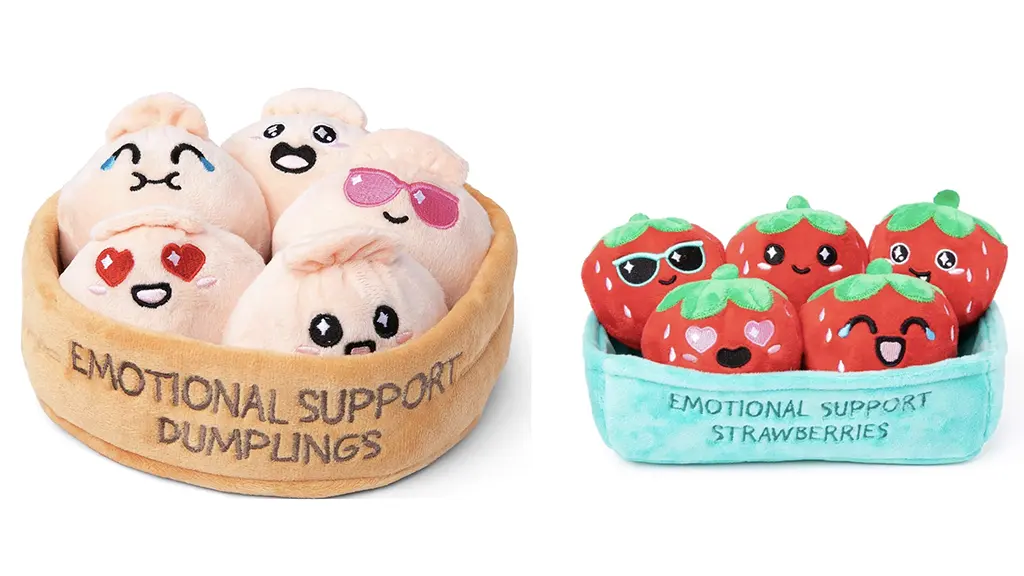 Un aliment confort iubit de toți, acum în formă de pluș! Aceste adorabile figurine de pluș cu mâncare arată exact ca cele reale. Sunt moi, amuzante și pur și simplu drăguțe. De la fericire și tristețe la râs și furie, plușurile Emotional Support sunt acum disponibile în formă de Chicken Nugget, Gomboț și Căpșună.