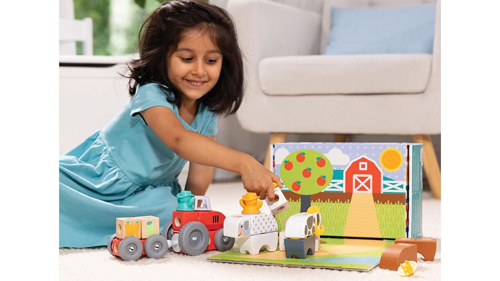 Creează animale de fermă și echipamente cu setul de 56 de piese, care conține cărămizi de construcție, elemente de conectare, figurine, accesorii din fetru și roți. În pachet se găsesc o vacă, o oaie, un purcel, un cal, o găină, precum și un tractor cu remorcă, furaje și un balot de fân. Conceput special pentru mâini mici și o IMAGINAȚIE MARE: cărămizile mari din lemn și accesoriile din fetru sunt perfecte pentru ca cei mici să poată construi în sus, în jos și în toate direcțiile, în timp ce își lasă liberă imaginația și își dezvoltă creativitatea.