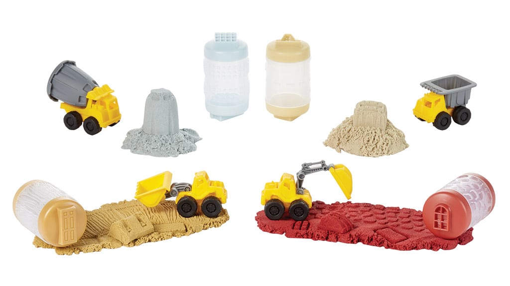 Copiii pot participa la o distracție de construcție fără sfârșit cu nisip care nu se usucă niciodată! Fiecare set conține una dintre cele patru tipuri de camioane, 100 de grame de nisip și două capace cu ștampilă. Nisipul este disponibil în diferite culori și texturi, pentru a imita cât mai bine șantierele reale de construcții. Acest joc dezvoltă creativitatea, abilitățile motorii fine și oferă copiilor ore întregi de distracție.