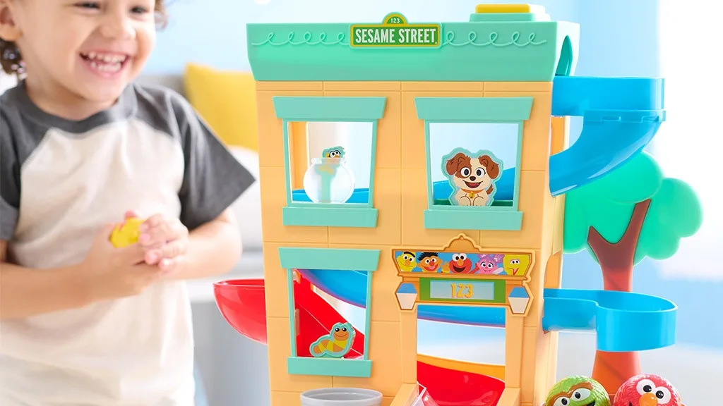Copiii își pot lăsa prietenii preferați din Strada Sesame să alunece pe acest set de joacă sinuos, pe mai multe niveluri, pot plasa cele trei bile în partea de sus, apoi pot apăsa butonul galben pentru a le elibera pe rând. La fiecare apăsare a butonului, Elmo spune fraze amuzante sau cântă melodia "Here We Go Loopty-Loo".