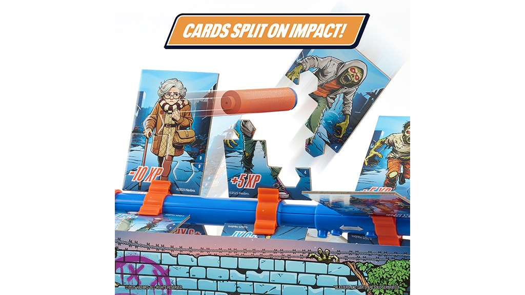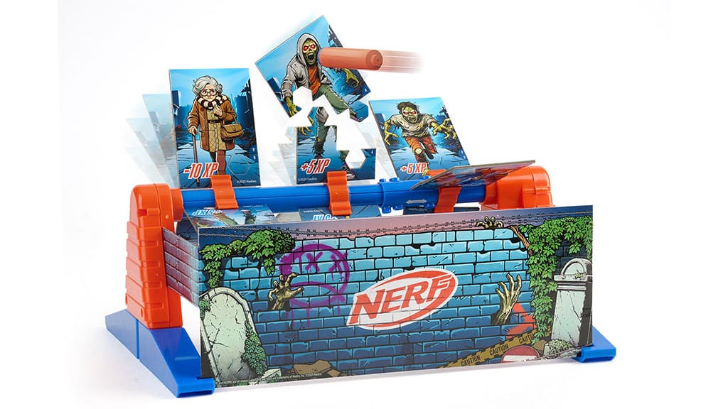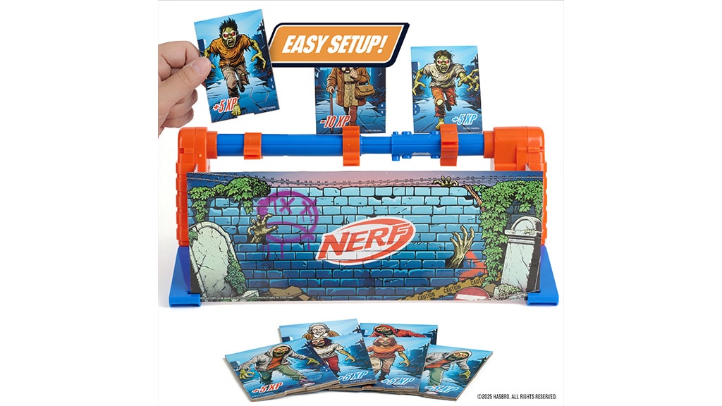 Copiii de 8 ani sau mai mari plasează cărțile Zombie pe cadrul rotativ NERF Zombie Strike, apoi pot alege dintre trei viteze: rotație lentă de 15 secunde, rotație rapidă de 30 de secunde sau mod cu viteză variabilă de 20 de secunde, astfel distracția nu se oprește niciodată. Apoi, trebuie să lovească cărțile Zombie de pe cadrul rotativ cu proiectile și lansatoare NERF, iar acestea se desfac ușor la impact, astfel jocul este simplu, scorurile pot fi urmărite rapid și este ușor să reîncepi jocul.