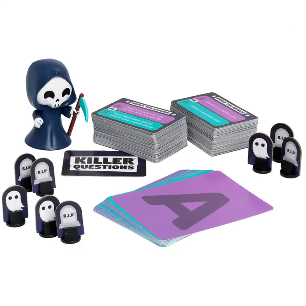 Jocul de societate Killer Questions va anima cu siguranță întâlnirile de familie și prieteni! Acest joc de întrebări și răspunsuri extrem de amuzant poate fi un mare succes nu doar printre copii, ci și printre adulți. Esența jocului este ca jucătorii să își pună întrebări unii altora, dintre care unele sunt cu adevărat dificile – oare tu ce ai alege? Jocul devine și mai palpitant datorită figurinei drăguțe a Morții, care ajută la coordonarea rundelor.