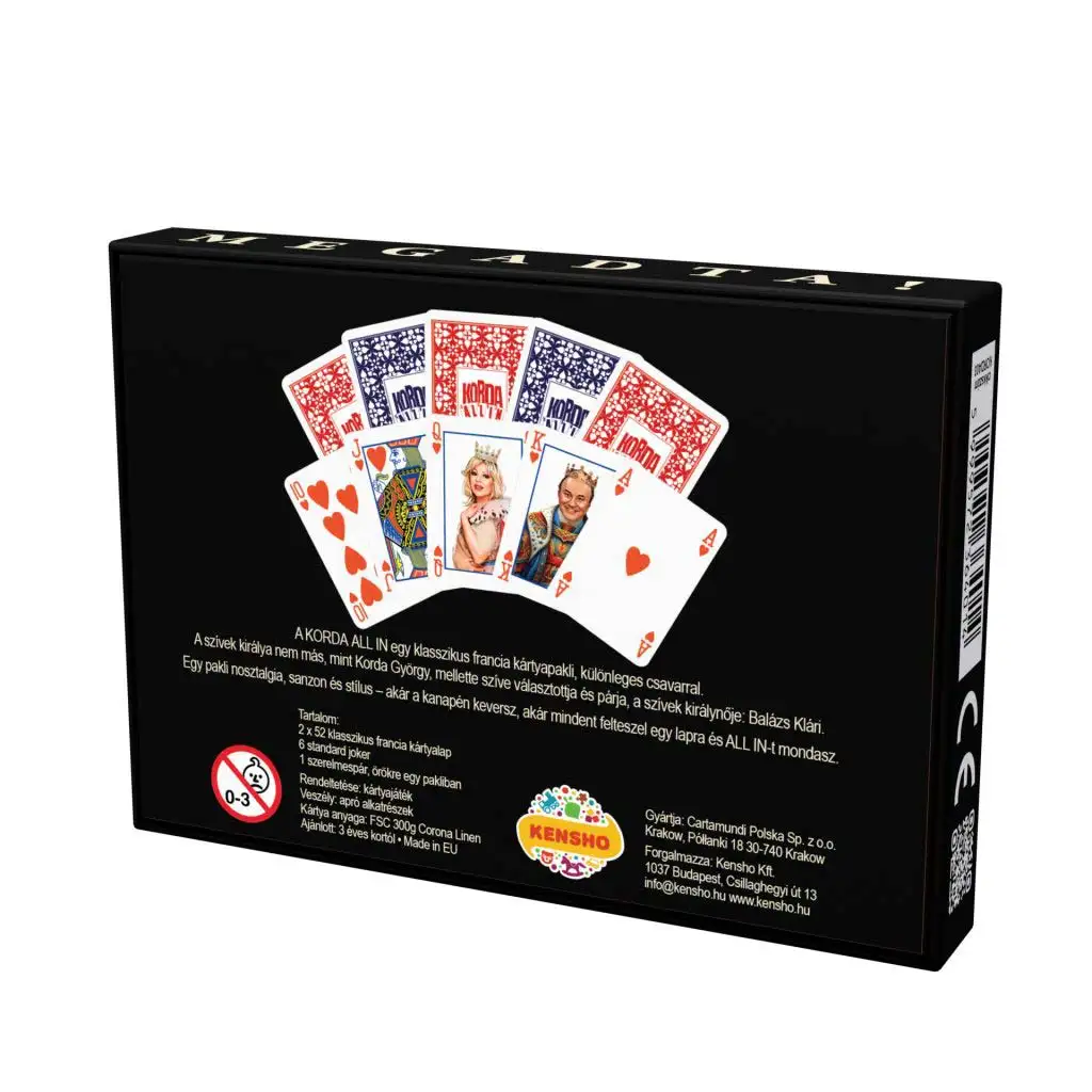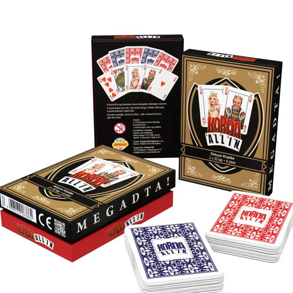 Pachetul dublu de cărți franțuzești Korda All-In Deluxe (2×52 cărți + 6 Joker) este o adevărată bijuterie pentru iubitorii jocurilor de cărți clasice, care aduce la masă nu doar plăcerea jocului, ci și stilul și umorul. Această ediție specială, de calitate premium, conține două pachete franțuzești complete, cu un total de 104 cărți de joc și 6 jokere, devenind astfel o alegere ideală pentru grupuri mai mari sau pentru partide lungi și serioase – fie că este vorba de poker, rummy, makao sau orice alt joc popular.