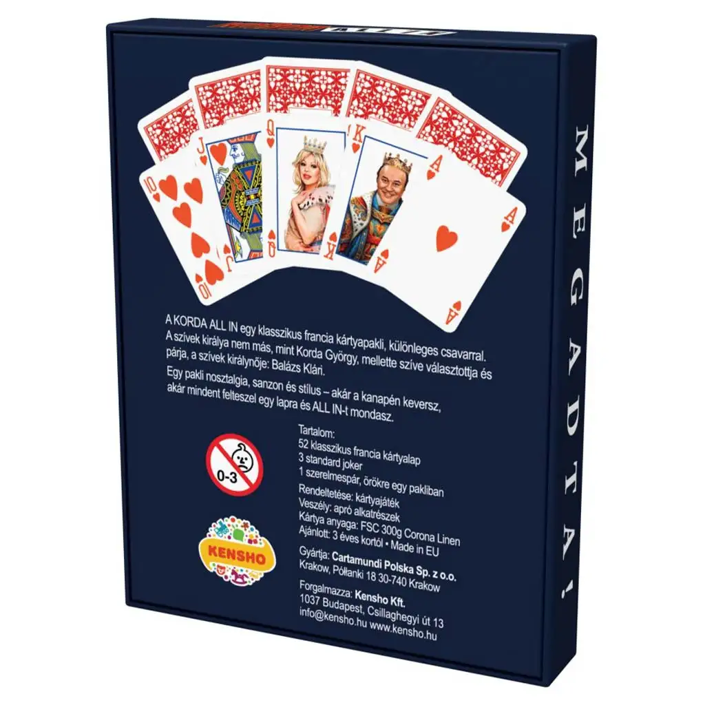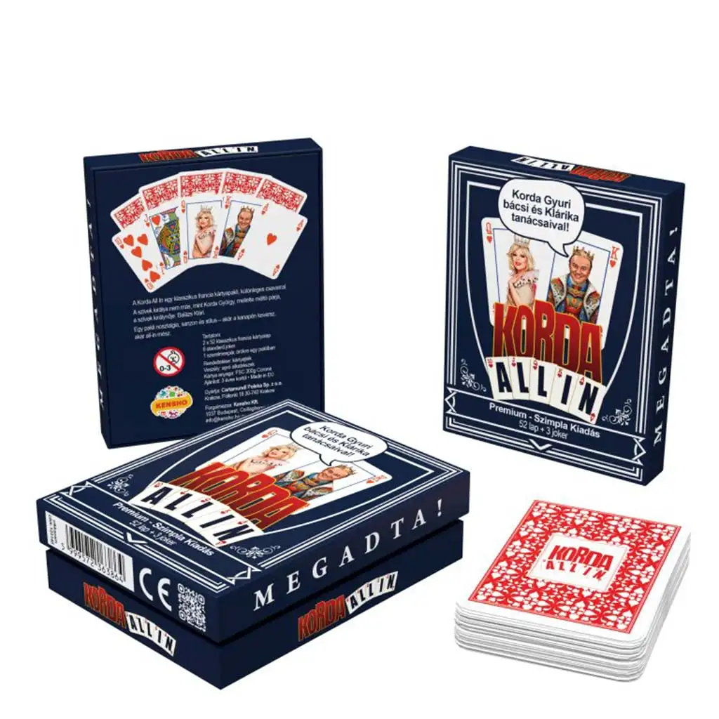 Pachetul de cărți franțuzești Korda All-in Clasic (52 de cărți + 3 Joker) va deveni noul favorit al iubitorilor de poker, acolo unde calitatea și stilul se întâlnesc – cu un mic accent maghiar! Acesta nu este doar un pachet de cărți tradițional, ci o adevărată raritate nostalgică, în care regele de inimă roșie este György Korda, alături de partenera sa fidelă, Klári Balázs, care apare ca regina de inimă roșie. Cărțile franțuzești cunoscute prind viață într-o ediție premium – cu stil, originalitate și garantat vor aduce zâmbete pe fețele tuturor jucătorilor.