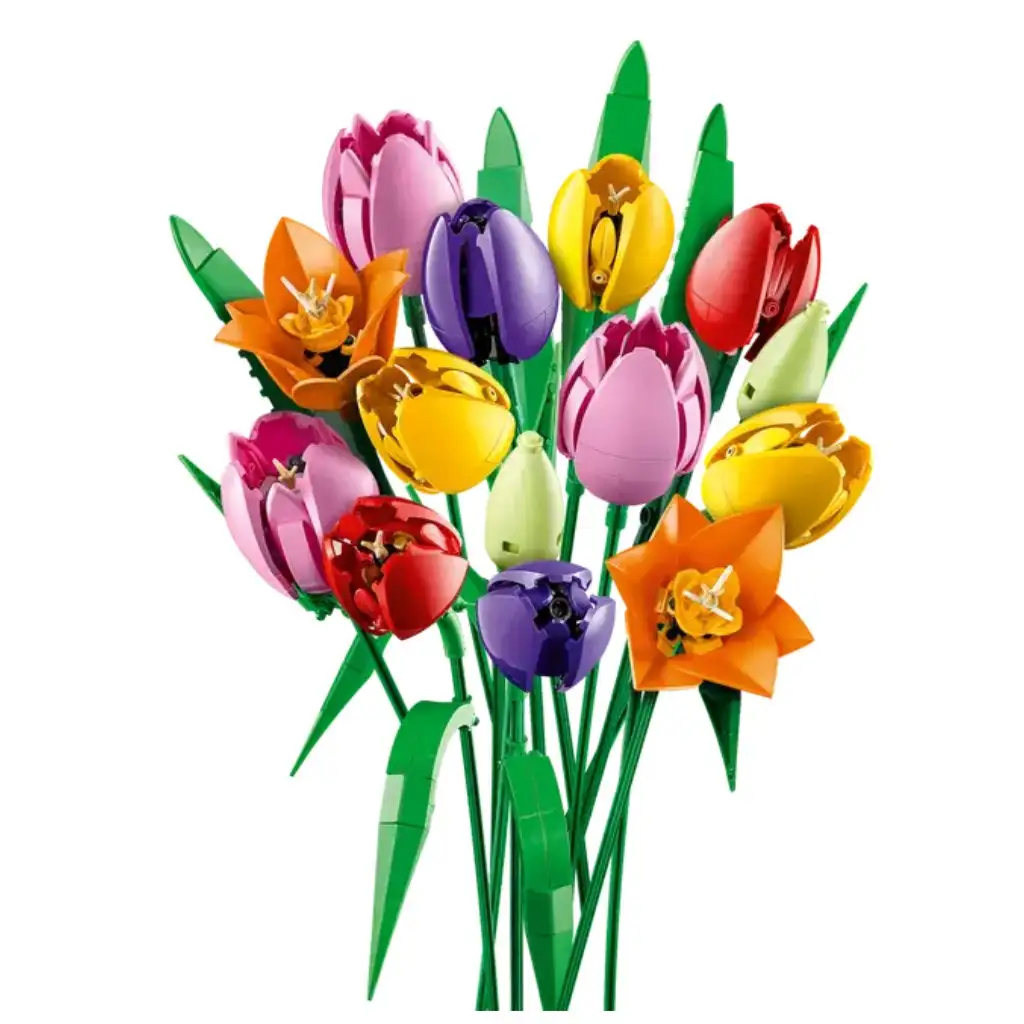• 5 LALELE LEGO® – Buchetul conține 5 lalele diferite, în culori și stadii de înflorire variate: muguri verzi, lalele mov închise, precum și lalele roșii, galbene și roz complet înflorite