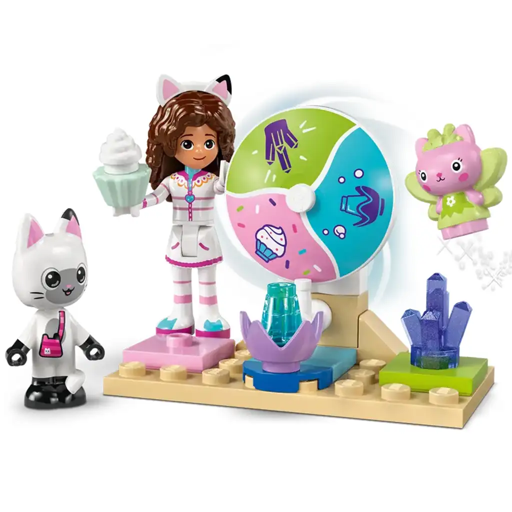 Acest joc creativ prezintă 2 locații din film și conține numeroase figurine LEGO (inclusiv Gabi, Pandi Pajti și Zâna Pisicuțelor). Muntele de Bomboane îi poartă pe cei mici într-o lume magică a dulciurilor. Personajele pot trece peste o cascadă colorată, plutind pe o gogoașă. Grădina Pisicuțelor este un loc minunat unde Zâna Pisicuțelor stă pe un tron de floare de cristal și unde comori ascunse îi așteaptă pe copii să le descopere. Ghidul colorat ilustrat, piesa mare de bază și modelele ambalate separat asigură copiilor o experiență creativă rapidă și ușor de început.