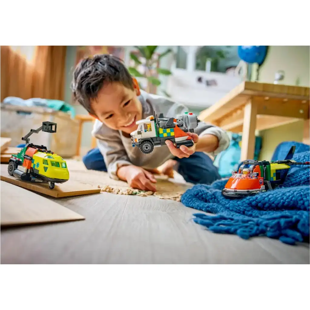 • 3 VEHICULE DE SALVARE ÎN 1 SET – Setul LEGO® City Avion, camion cu coș de ridicare și vehicul cu pernă de aer remix (60505) este un set imagina tiv cu 3 vehicule de salvare constructibile și combinabile, recomandat de la 7 ani.