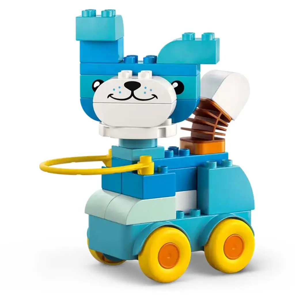 Inspiră creativitatea copiilor mici cu setul de construcție Animale pe roți 3 în 1 (10448)! Micii iubitori de animale se pot bucura de joacă plină de imaginație în multe moduri, în timp ce construiesc rața, peștele și câinele special concepuți pentru preșcolari, sau pot inventa animale cu totul noi! Copiii preșcolari care adoră jucăriile LEGO® DUPLO® cu vehicule pot construi figurinele pe o bază cu roți pentru a le face să alerge sau le pot trage cu ajutorul unui mâner.