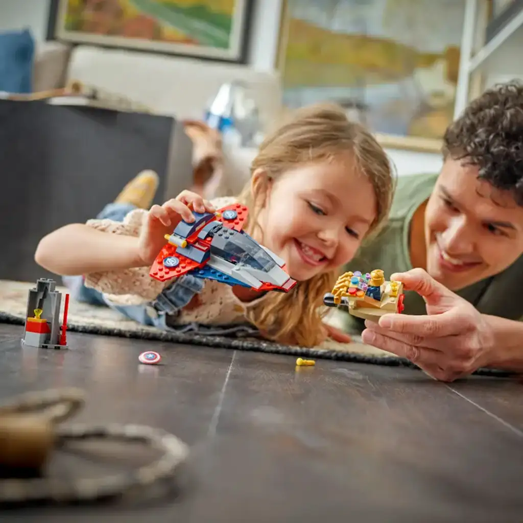Acest set de construcție, perfect și pentru joacă, include 2 minifigurine: Thanos, într-o navă spațială inspirată de Mănușa Infinitului, echipată cu „degete” mobile și lansator de rachete; și Căpitanul America, cu un Quinjet tare dotat cu 2 lansatoare, cabină pentru pilot care se deschide și un spațiu de depozitare pentru scutul său. Imaginația este inspirată de o construcție separată, o piatră cosmică, deoarece Căpitanul America încearcă să-l oprească pe Thanos să obțină această piatră valoroasă. Fiecare pungă conține piese de construcție și o cărămidă mare de bază, facilitând astfel asamblarea rapidă a construcțiilor și a personajelor, pentru ca joaca să poată începe imediat. Ghidul intuitiv este inclus sub formă de broșură colorată. Setul conține 107 piese.