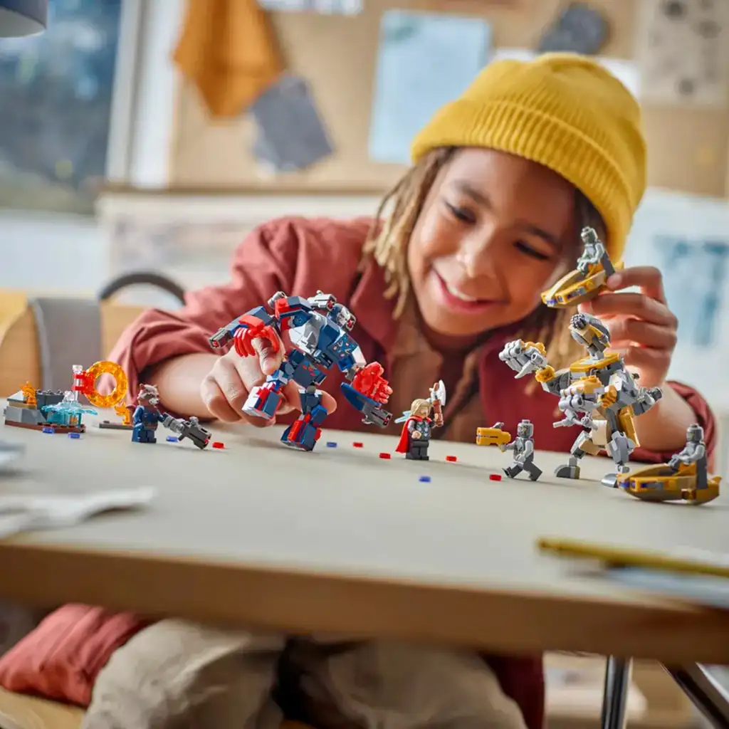 • Lupte de supereroi pline de acțiune pentru copii – Avengers: Endgame Thor contra luptătorilor chitauri este un set LEGO® ǀ Marvel construit pentru băieți și fete de 8 ani și peste, care adoră roboții jucărie și eroii de acțiune