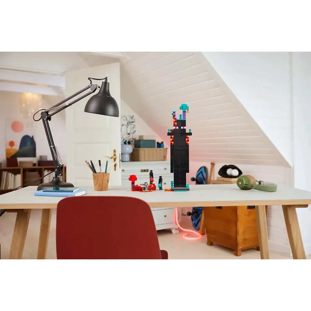 Construcția principală este un turn în formă de Sfârșitor, cu un portal către Nether în cap, două balcoane pe umeri și două camere care includ o masă de lucru, o masă de fermecat și un depozit unde poți păstra perlele Sfârșitorului. Pe picioarele turnului, scările duc spre nivelurile superioare, mâinile articulate sunt mobile, iar în jurul modelului sunt elemente din biomele pădurii mlăștinoase și pădurii Crimson. Setul include minifigurinele Protectorul Dimensional, Raiderul Regatului și 2 minifigurine Sfârșitor, plus 2 figurine mob Căpușe de Sfârșit. Setul conține arme precum o arbaletă, o sabie din Netherite și un scut. Modelul Turnului Sfârșitului poate fi reconstruit în două fortărețe de culori diferite, astfel încât jucătorii să se poată lupta între ei. Construiește cu ajutorul aplicației LEGO® Builder! Setul conține 867 de piese.