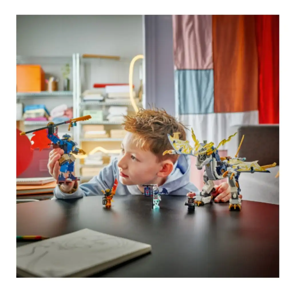 • Robot de jucărie și dragon – Copiii se pot juca separat cu piesele, dar pot fixa robotul articulat pe spatele primului robot-dragon NINJAGO® pentru a crea Robotul călărețului de dragon Rouge
