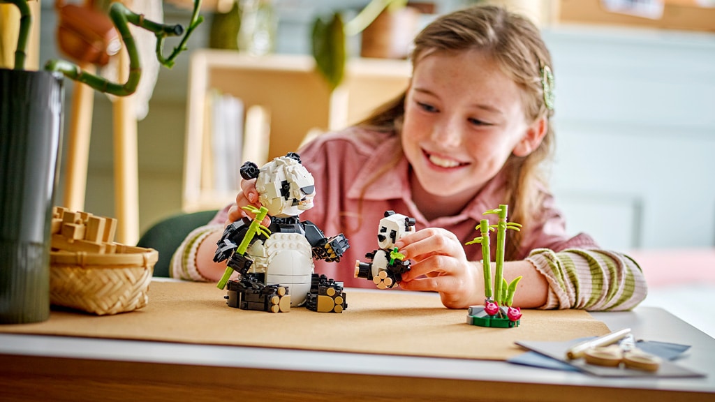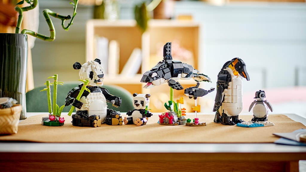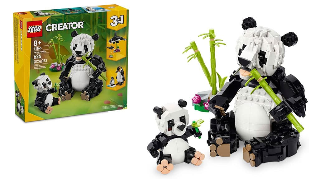 De la panda la pinguini și orci, acest set LEGO Creator 3-în-1 Animale Sălbatice: Familia de Panda aduce animalele sălbatice în timpul de joacă. Acest set conține 626 de piese, astfel încât copiii de 8 ani și mai mari pot construi panda cu puiul său, pinguinul cu puiul său sau orca cu vițelul său, toate din aceleași cărămizi de construcție. Copiii pot personaliza familiile de animale după bunul plac – orca își poate mișca corpul și aripioarele; pinguinul își poate mișca capul, aripioarele și picioarele; iar panda își poate mișca labele, gâtul, gura și capul. Setul include un mic bambus pentru familia de panda, o platformă de aterizare înghețată pentru puiul de pinguin și două suporturi transparente pentru familia de orci.