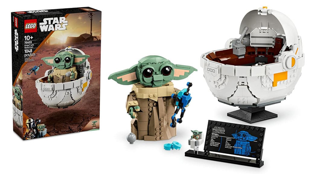 Proiectat pentru copii de 10 ani și mai mari, setul de construcție LEGO Star Wars Grogu cu cărucior plutitor conține 1.048 de piese. Setul include o figură miniaturală Grogu, un cărucior în care poate fi expus, precum și o creatură broască cu care Grogu se poate juca sau o poate gusta. Figura Grogu este complet articulată, astfel încât copiii îi pot mișca brațele, degetele, urechile și capul după bunul plac.