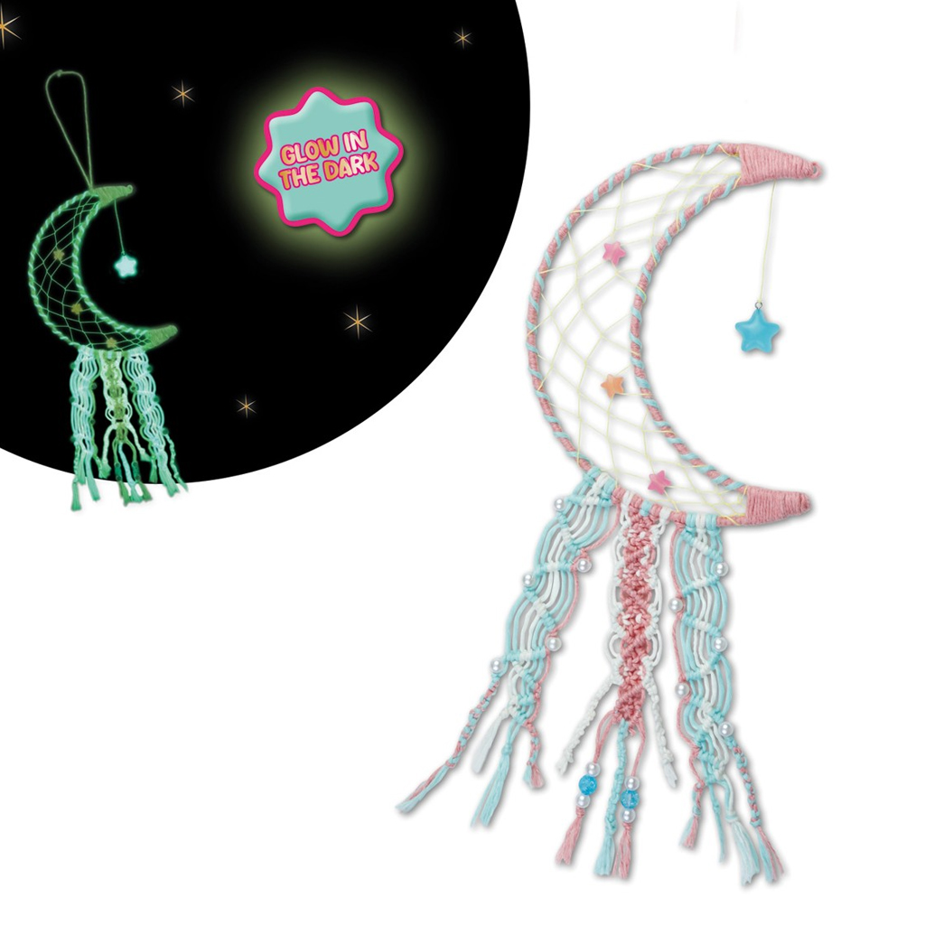 Setul conține toate elementele necesare pentru realizarea unui frumos prindător de vise în formă de lună. Cu ajutorul firelor colorate, mărgelelor și ornamentelor, copiii își pot personaliza creația după propriul gust. Datorită elementelor care luminează, prindătorul de vise rezultat strălucește și în întuneric, creând astfel o atmosferă cu adevărat magică.