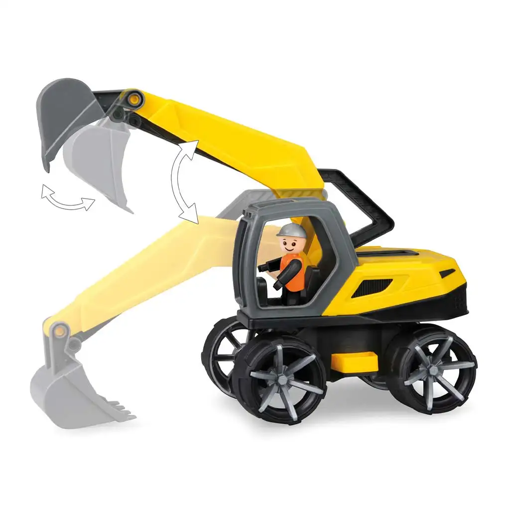 Cabina șoferului este complet accesibilă pentru joc, iar în interior o figurină LENA® ajută la pornirea marilor lucrări. Cu brațul mobil al excavatorului, lucrările de terasament devin o joacă de copii, iar șasiul blocabil asigură că utilajul rămâne stabil în timpul jocului. Axele din oțel galvanizat de 4 mm garantează durabilitatea pe termen lung, iar cu cupla pentru remorcă se pot atașa și mai multe utilaje, după cum cere jocul.
