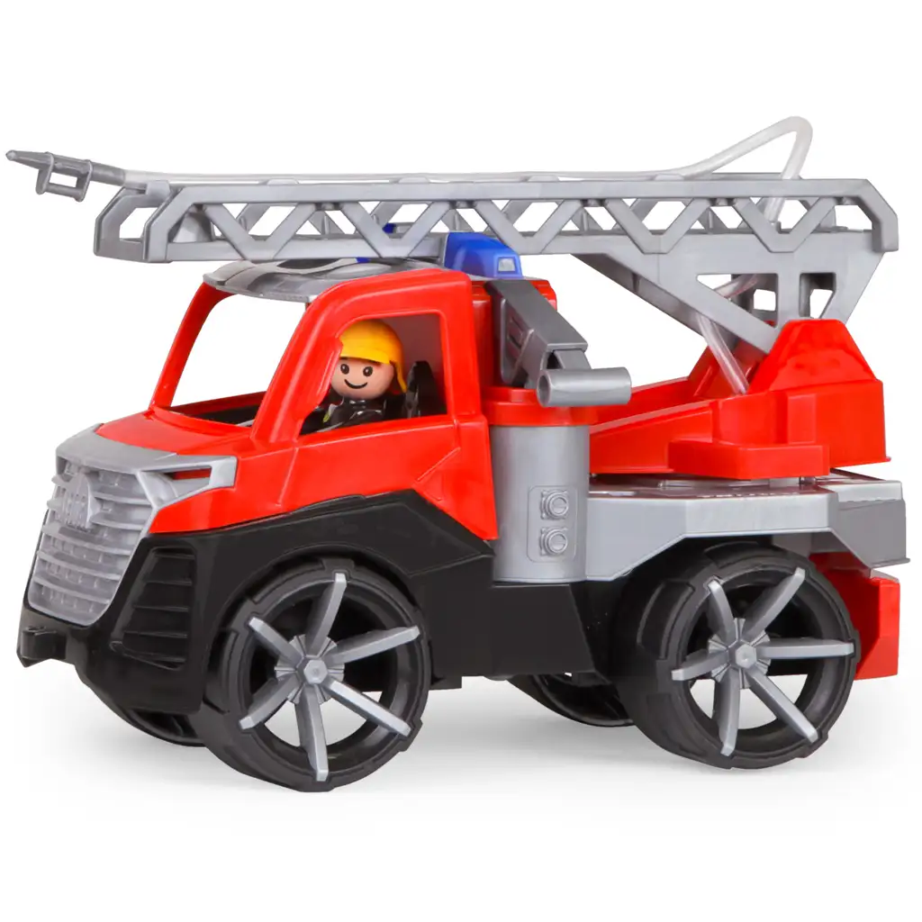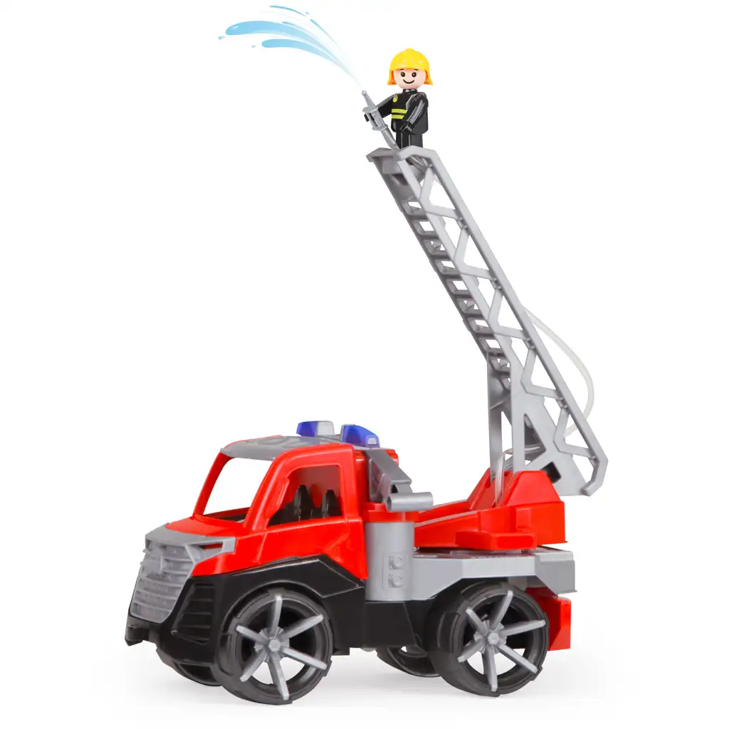 Mașina de pompieri include o figurină veselă, zâmbitoare, de pompier, care poate coordona acțiunea fie din cabina șoferului, fie de pe scară. La capătul scării lungi, rabatabile și rotative, se află un furtun cu funcție de pulverizare a apei, care chiar poate stropi cu apă – doar umple-l cu apă și distracția stingerii incendiilor poate începe! Componentele mobile încurajează jocul de rol, ajută la dezvoltarea abilităților motrice fine și oferă multe momente pline de bucurie.