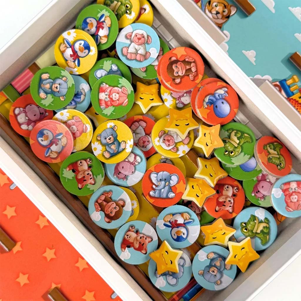 - Conținutul cutiei: 40 de discuri reprezentând jucării de pluș (10 pentru fiecare jucător), 4 planșe de dormitor (câte una pentru fiecare jucător), 24 de cartonașe cu obiective (modul ușor pe o față, modul dificil pe cealaltă), 9 stele