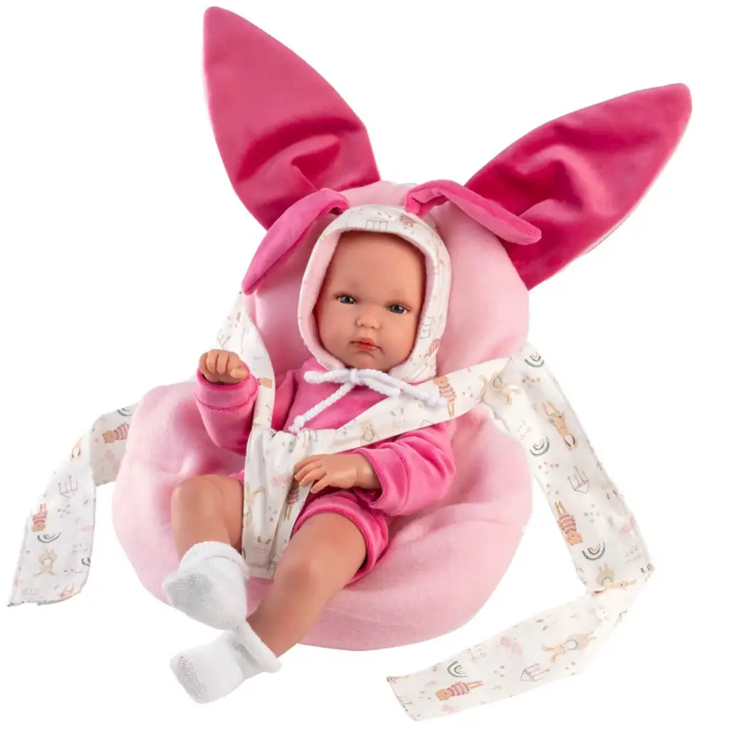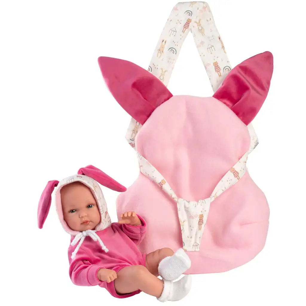 Perna port-bebe roz, moale și din pluș, cu două urechi mari de iepuraș, conferă jucăriei o atmosferă aproape „de poveste”. Fetițele o vor lua cu bucurie oriunde și vor avea grijă de ea: o vor îmbrăca, o vor adormi, o vor legăna sau pur și simplu o vor îmbrățișa.