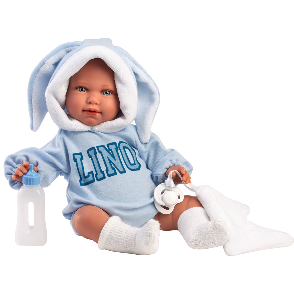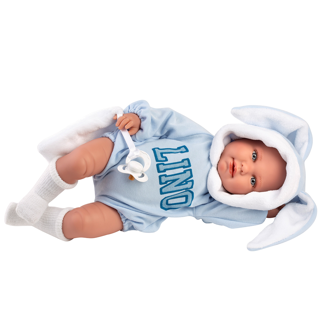 Llorens: Lino, păpușă plângătoare de 45 cm, îmbrăcată într-un costum cu urechi de iepure