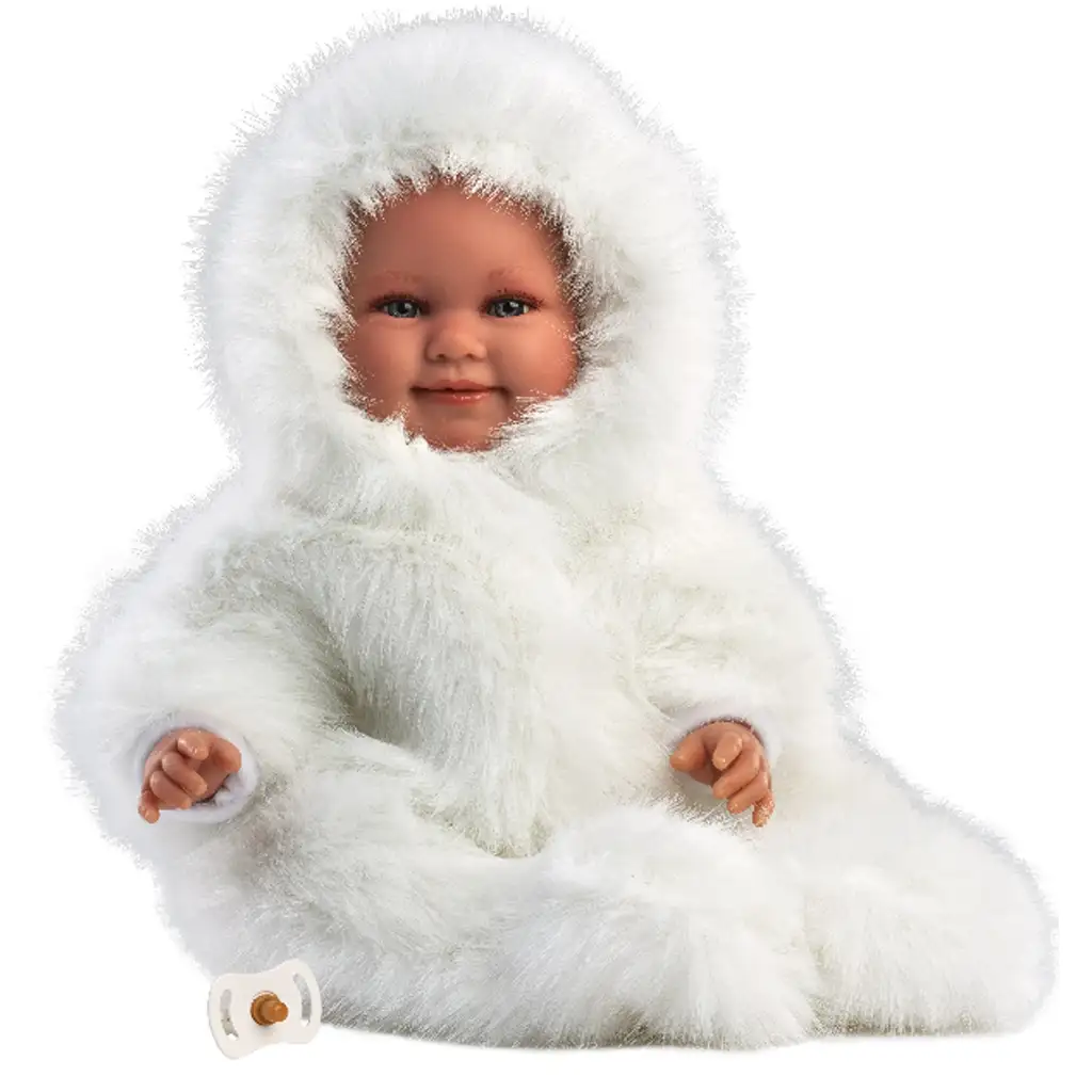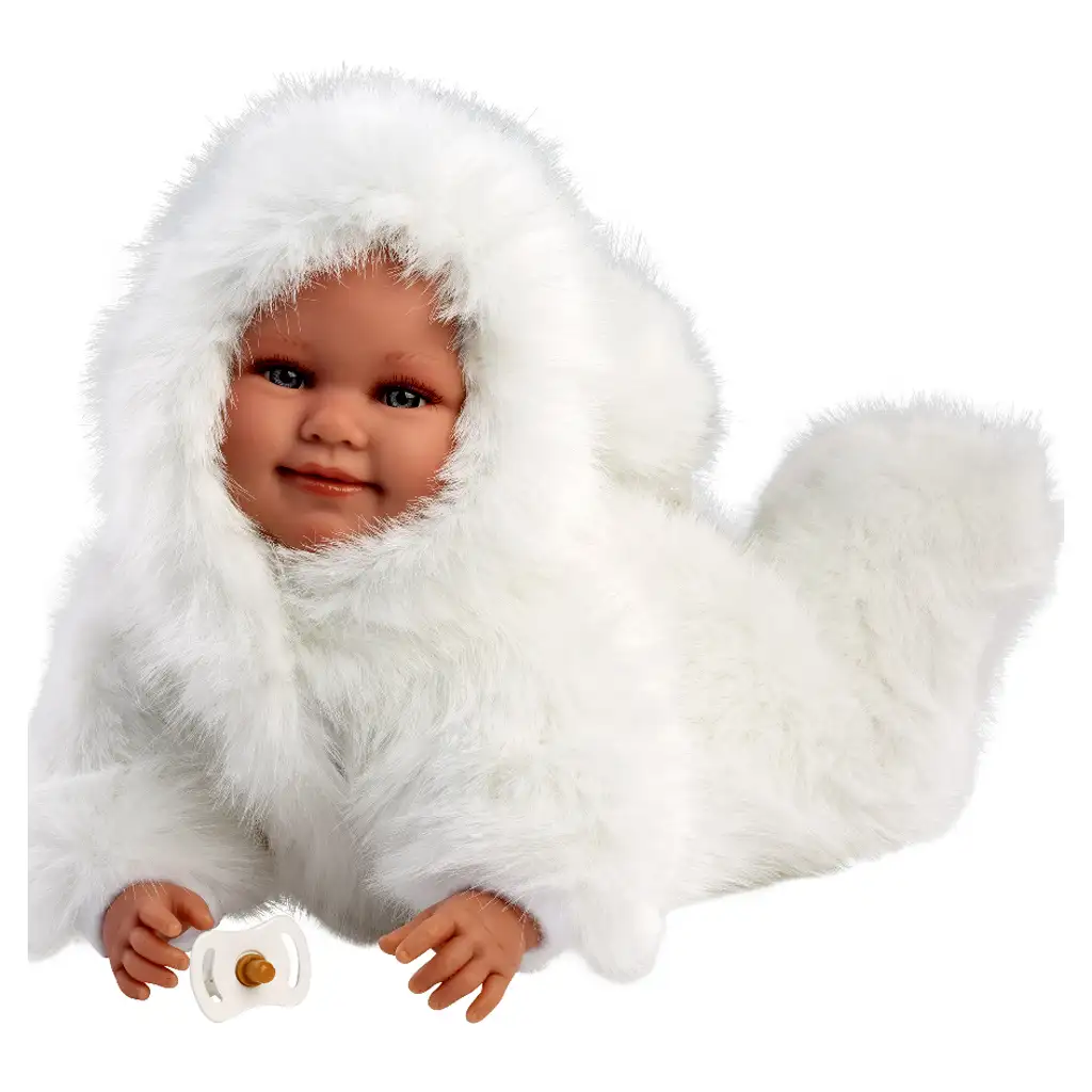 Evaluare Llorens: Luka, păpușă zâmbitoare de 45 cm cu suzetă, în haină de catifea albă