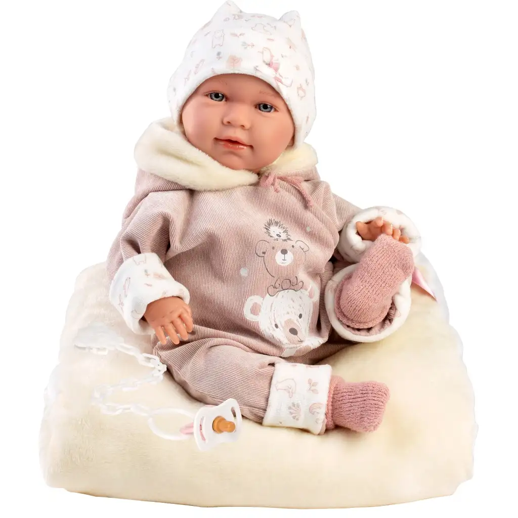 Llorens: Păpușă Lala de 42 cm cu sunet, îmbrăcată în haine cu ursuleți, cu pătuț.