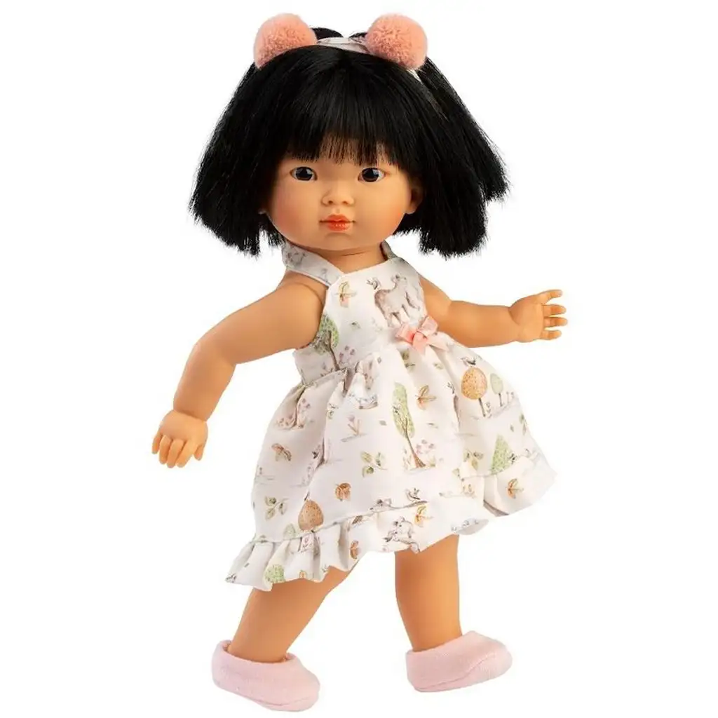 Lu este o păpușă adorabilă de 28 cm, care este combinația perfectă de farmec și jucăușenie. Datorită dimensiunii sale mici, este ideală chiar și pentru cei mai mici copii care se joacă cu păpuși - ușor de ținut în mână, de îmbrățișat și de luat oriunde. Banda de păr roz cu ciucuri și coafura sa dreaptă, neagră, cu aspect natural, o fac cu adevărat specială și elegantă, în timp ce rochia de vară veselă, cu imprimeu de animale, asigură că fiecare experiență de joacă este plină de bucurie.