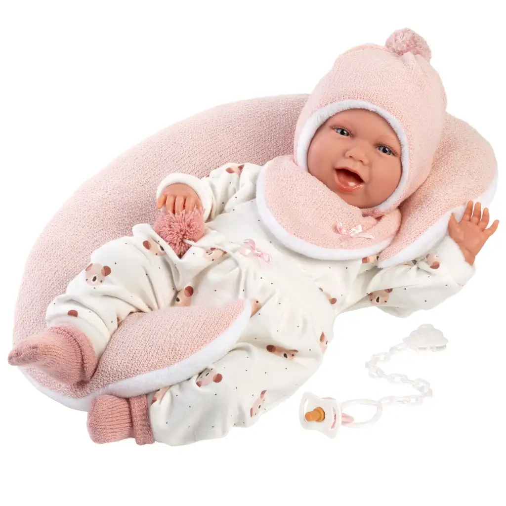 Llorens: Păpușă Mimi de 42 cm cu sunet, cu pernă de burtă în haine cu ursuleți.