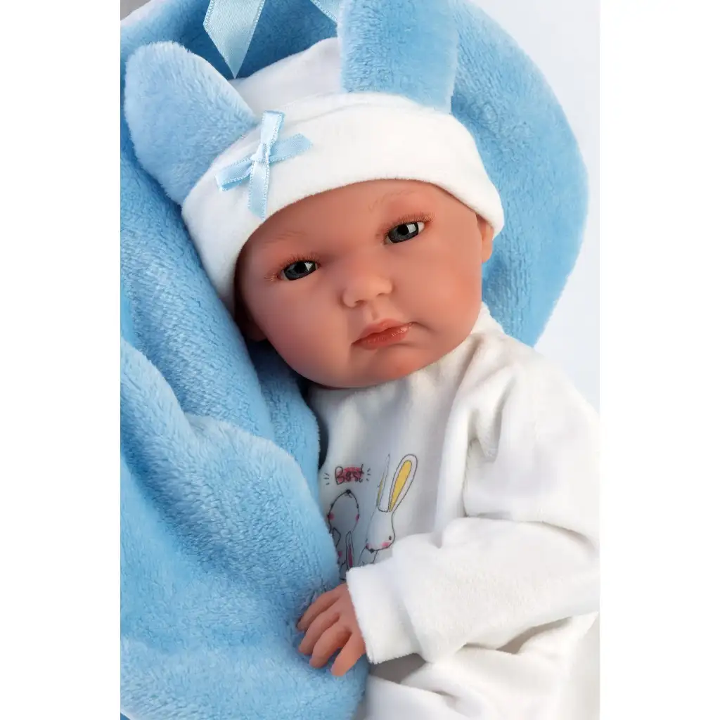 Llorens: Păpușă de 35 cm cu sac de dormit albastru cu iepurași.Llorens: Păpușă de 35 cm cu sac de dormit albastru cu iepurași.