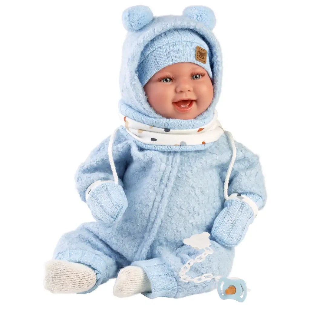 Llorens: Păpușă nou-născută de 44 cm cu sunet, îmbrăcată în haine cu glugă albastră.