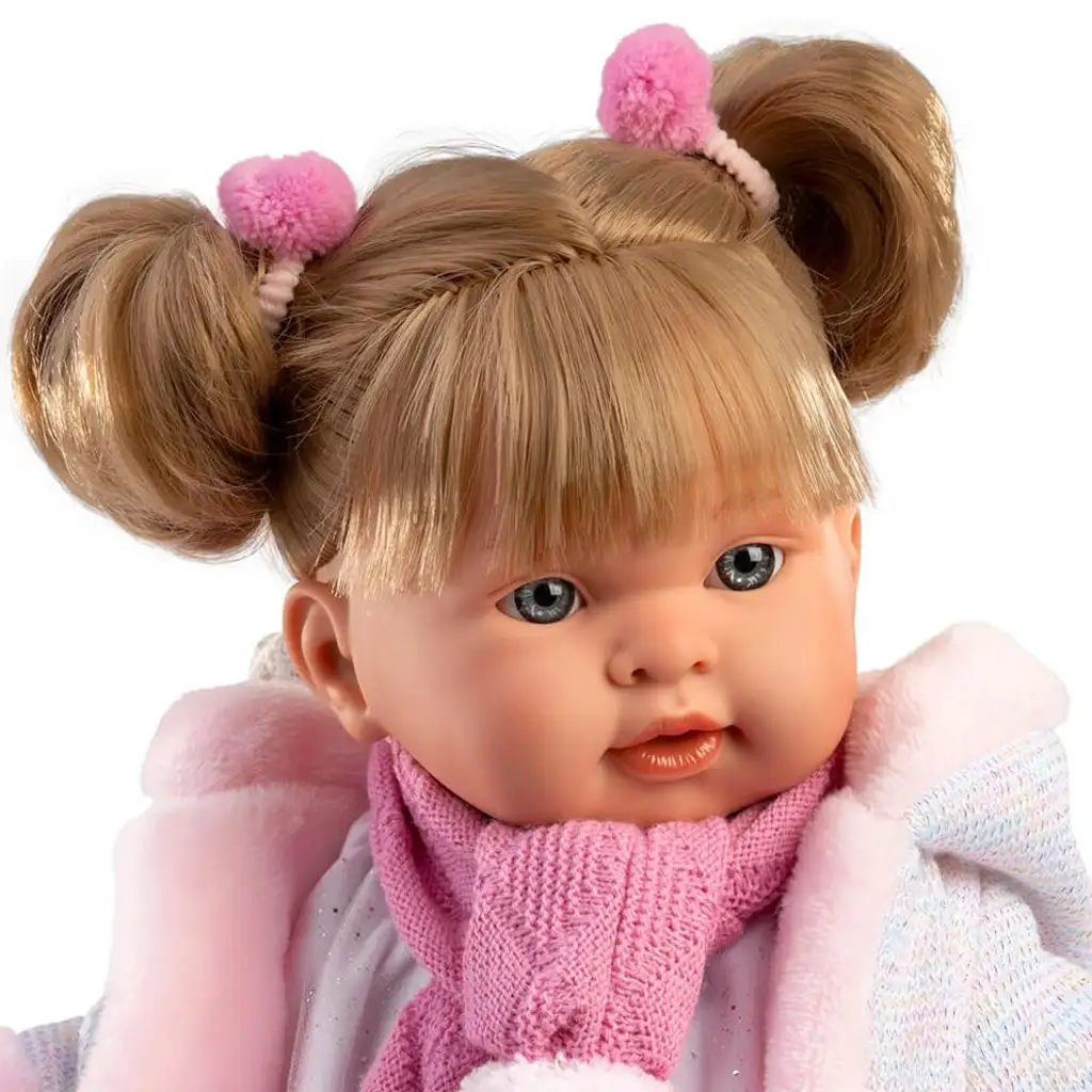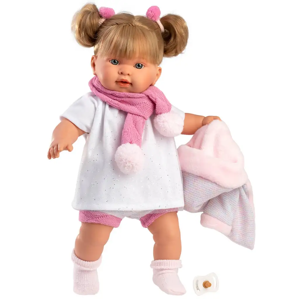 Evaluare Llorens: Păpușă plângătoare Alexandra de 42 cm cu suzetă și fular roz cu ciucure.