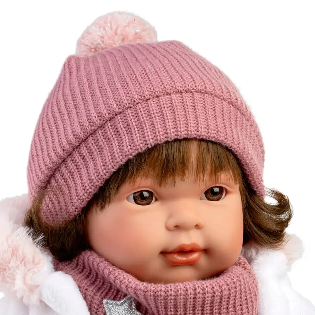 Dacă cauți o păpușă cu adevărat adorabilă, stilată și realistă, Carla va fi alegerea perfectă. Păpușa plângătoare de 42 cm de la Llorens vine îmbrăcată într-o rochie roz strălucitoare, cu efect de pluș, decorată cu mici modele de stele negre. Aspectul de iarnă al păpușii este completat de un palton alb moale, o căciulă tricotată roz pudră cu pompon, un fular circular asortat și jambiere – fiecare detaliu emană căldură și farmec.