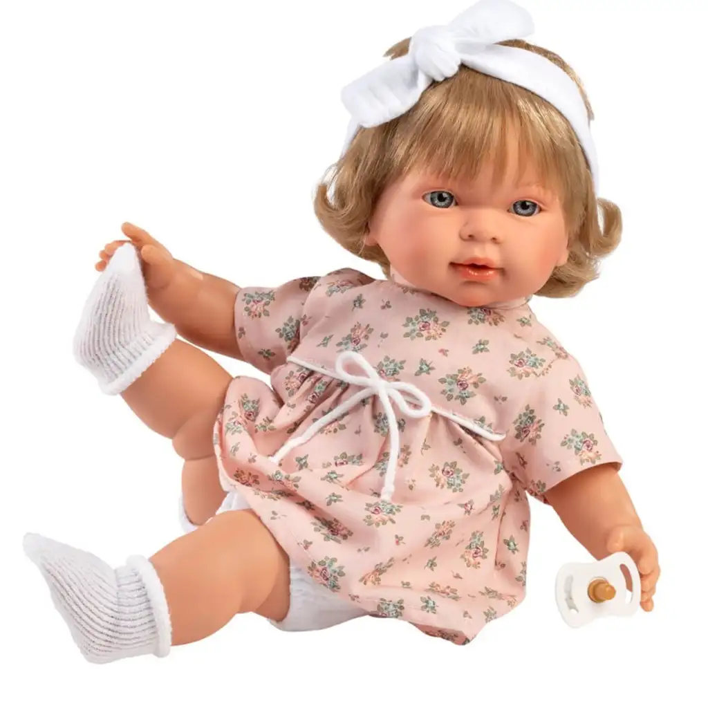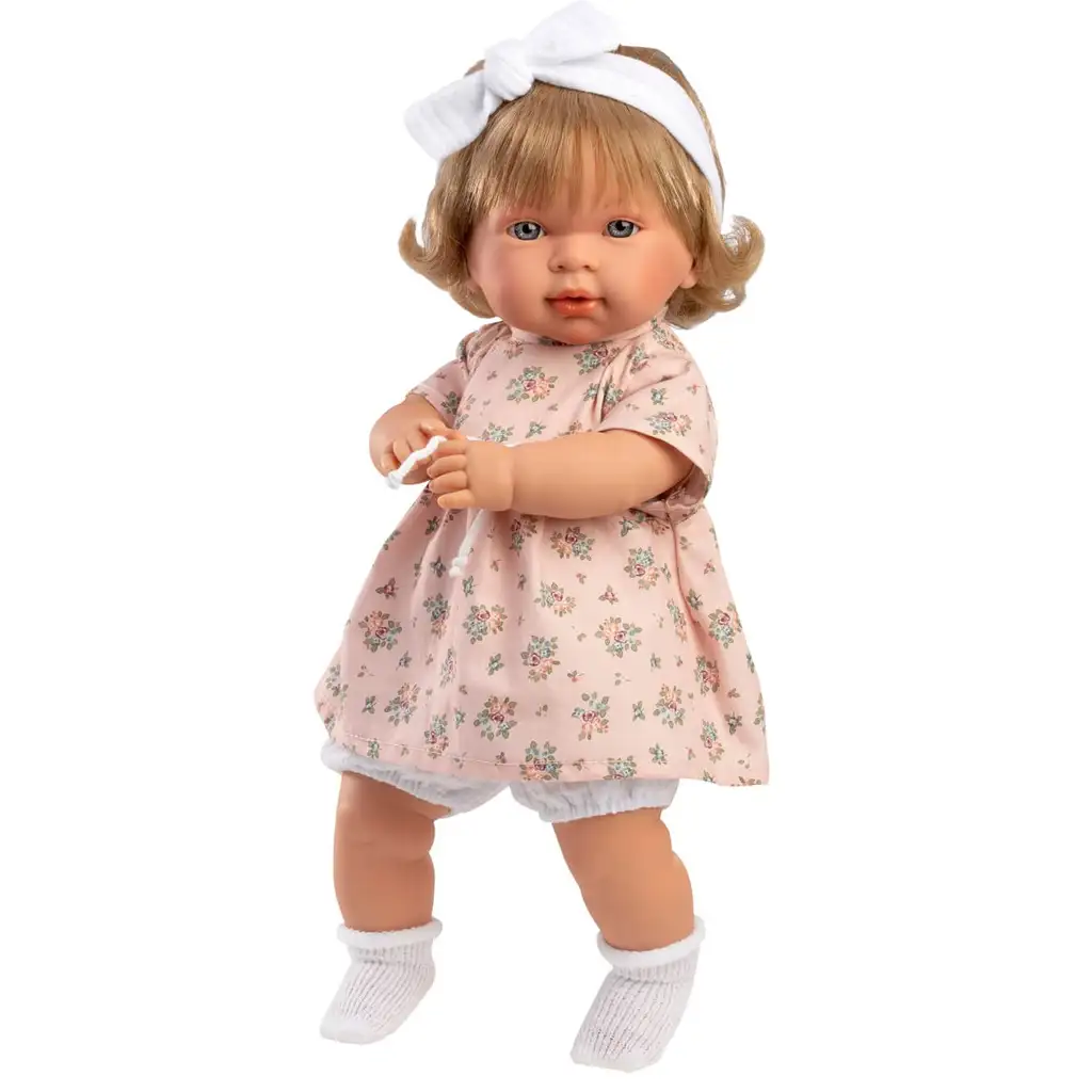 Llorens: Păpușă plângătoare Carla de 42 cm în rochie cu flori și bentiță.Llorens: Păpușă plângătoare Carla de 42 cm în rochie cu flori și bentiță.