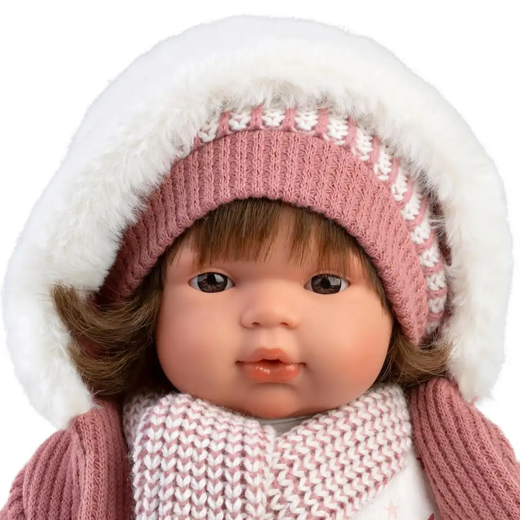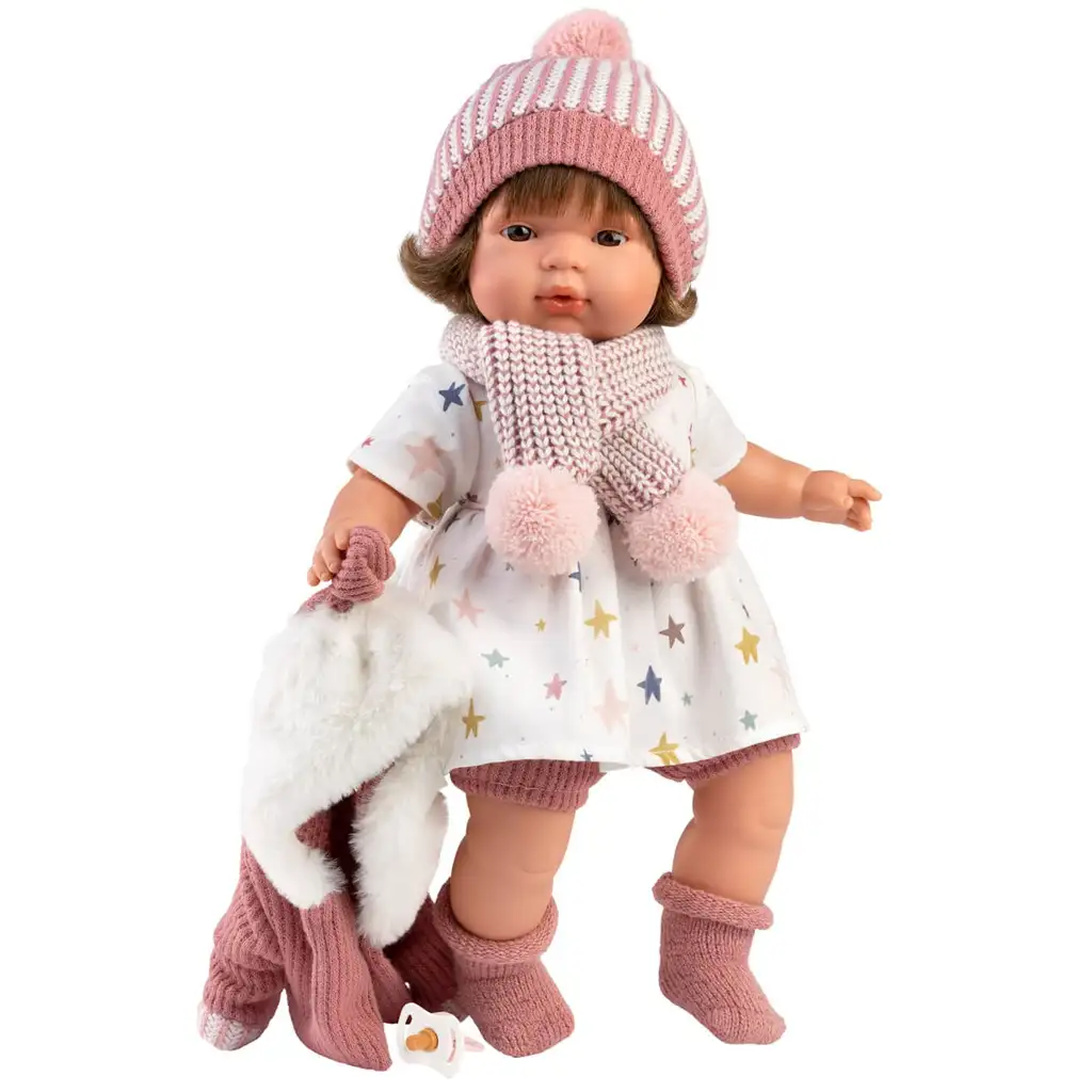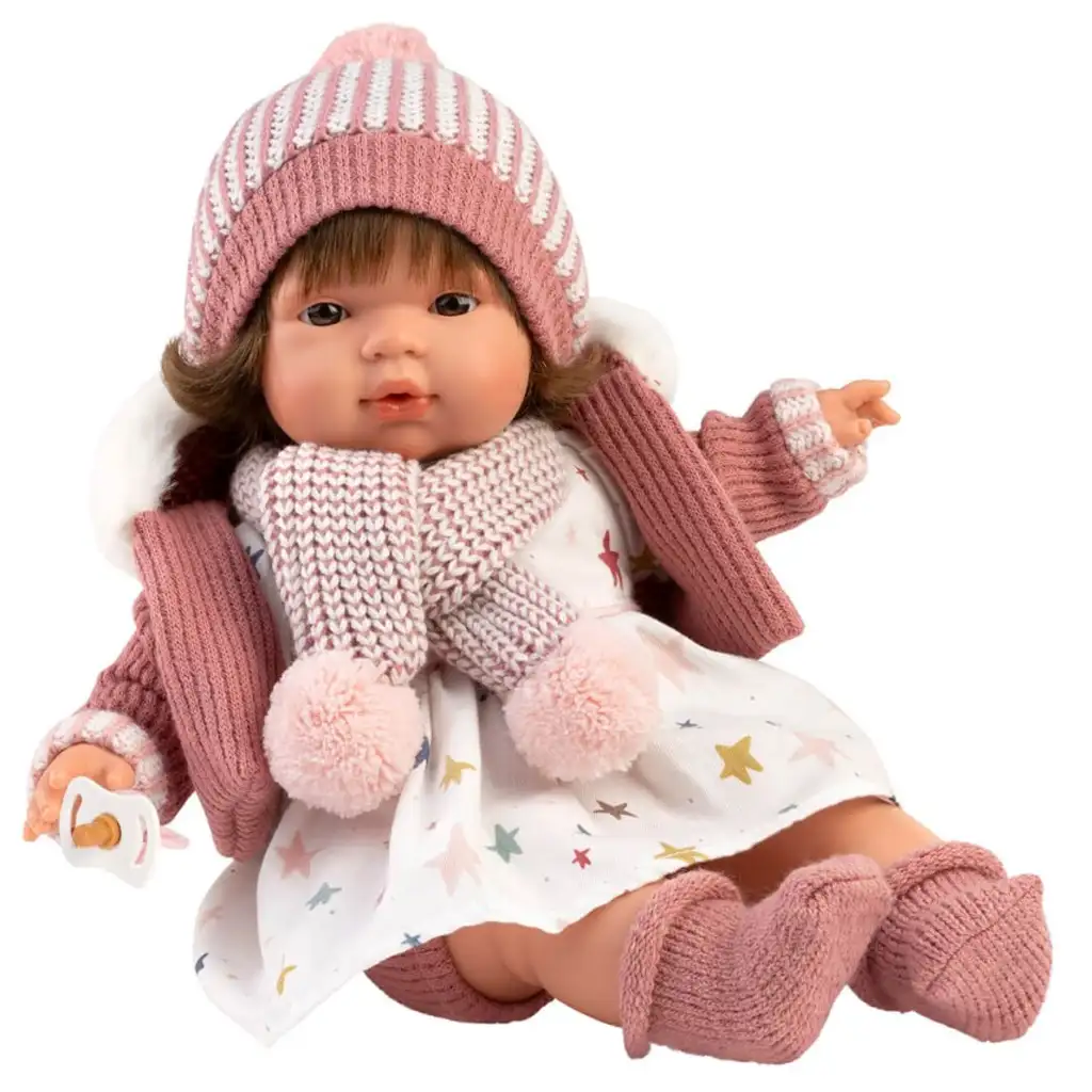 Lola este o păpușă plângătoare adorabilă de 38 cm din colecția Llorens, care cu siguranță va cuceri inima fetiței tale. Rochița cu model de stele îi oferă un aspect jucăuș și vesel, aducând zâmbete încă de la prima întâlnire. Rochia se potrivește perfect cu căciula tricotată roz pudră cu dungi albe și pompon, precum și cu fularul care se termină în două ciucuri mari, chiloții și șosetele călduroase. Setul include și o haină roz cu blană albă moale, pe care Lola o ține în mână, făcând jocul mai realist și mai distractiv.