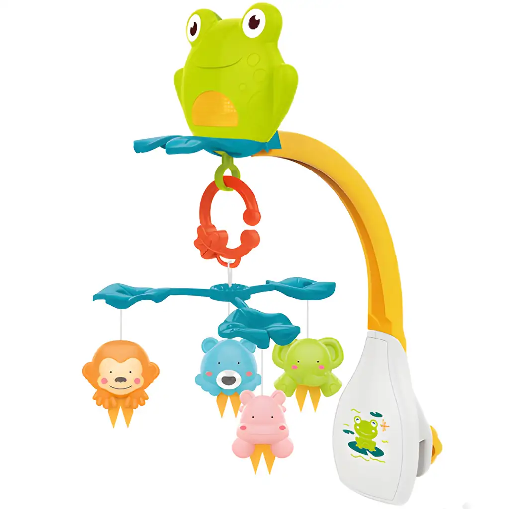 Caruselul vesel pentru pătuț cu sunete este cu adevărat un accesoriu drăguț și distractiv pentru orice bebeluș. Acest carusel fermecător pentru pătuț vine sub forma unei broscuțe adorabile, care cu siguranță va aduce bucurie și va captiva copiii mici. Caruselul poate fi atașat ușor și în siguranță de marginea pătuțului, devenind astfel ușor accesibil pentru bebeluș, fie că este timpul de somn sau de joacă.