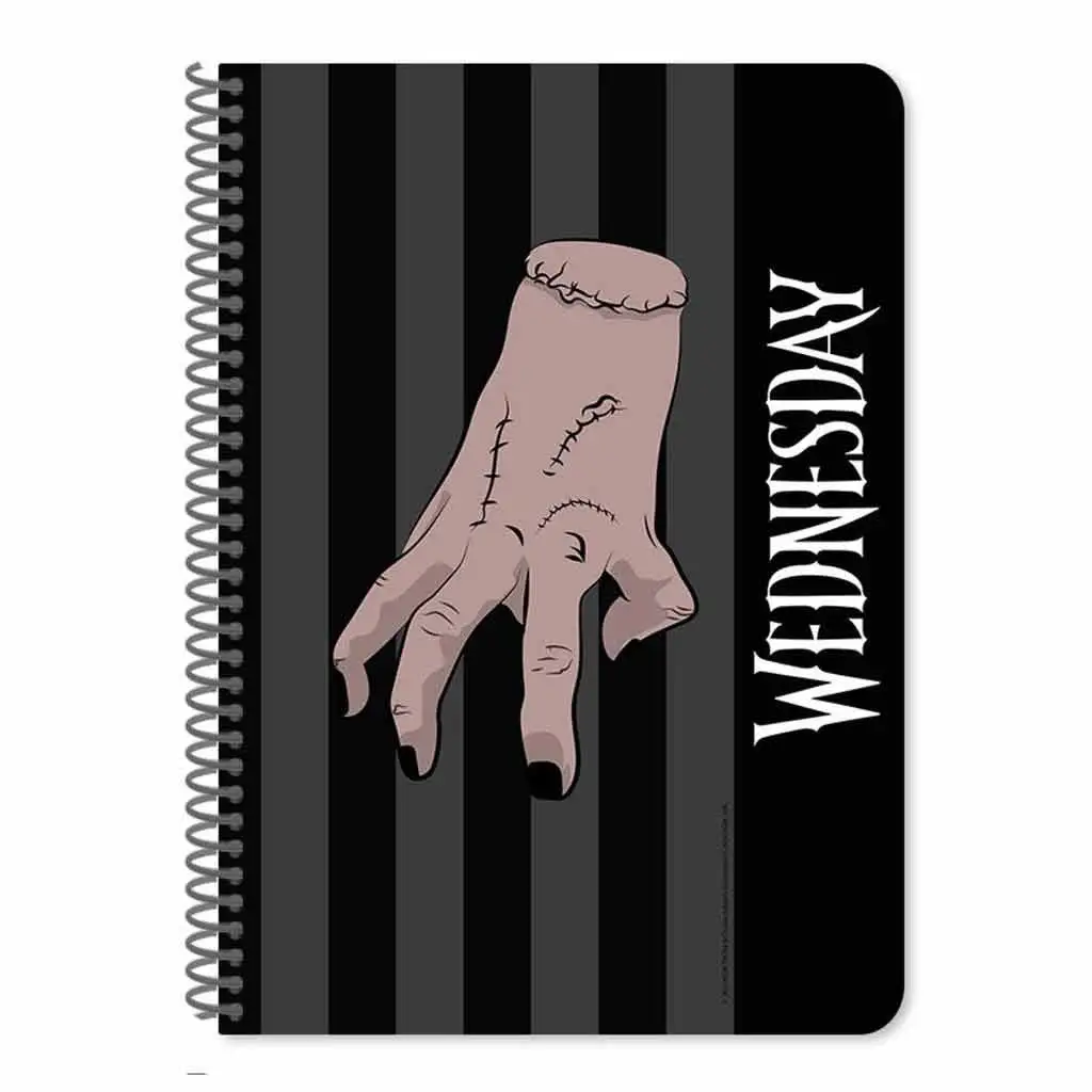Dezvăluie-ți creativitatea cu acest caiet special cu spirală și linii Luna Wednesday! Caietul este alegerea ideală pentru orice fan al familiei Addams care iubește stilul întunecat și mistic. Acest caiet de dimensiune A5, cu 60 de pagini, este disponibil în două variante, ambele decorate cu grafica iconică a lui Wednesday Addams. Pe una dintre coperți este vizibilă jumătatea personajului Wednesday în alb-negru, iar pe cealaltă apare faimoasa Mână, ambele având un design puternic și atrăgător.