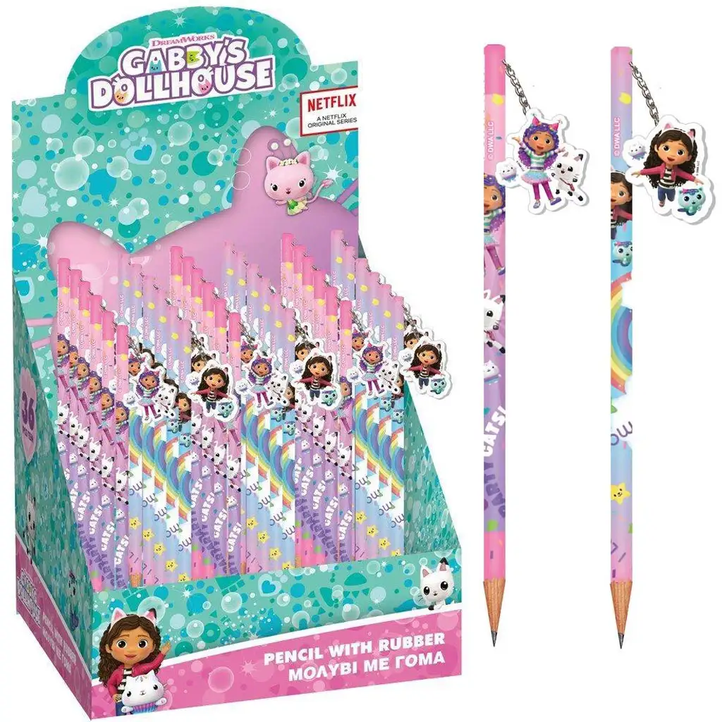 La capătul creionului se află o gumă de șters în formă de mini Gabby, atașată de un lanț, care nu este doar un instrument practic pentru corectarea greșelilor, ci și o mică jucărie în sine. Designul colorat este plin de curcubeie, stele și motive cu pisici, care cu siguranță vor aduce un zâmbet pe fața celor mici în timp ce învață sau desenează. Forma creionului este confortabilă, ușor de ascuțit și are grosimea potrivită pentru mâinile copiilor, ajutând astfel la dezvoltarea unui mod corect de a ține creionul.
