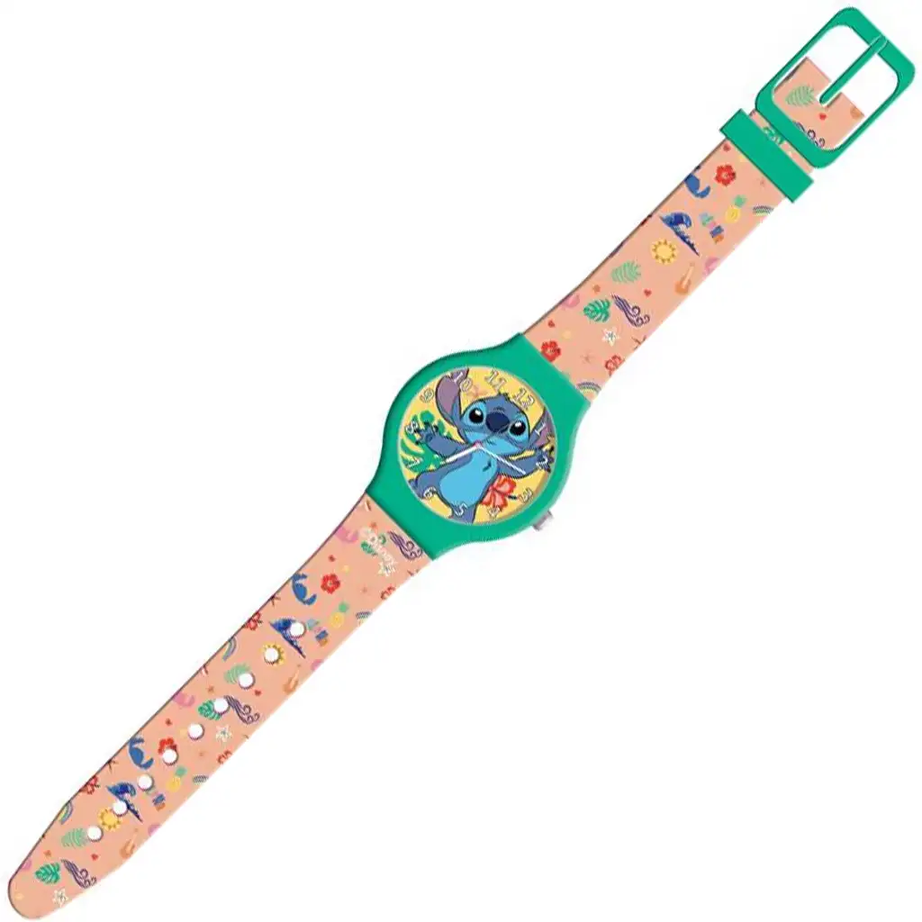 Brățara din silicon a ceasului, moale, plăcută la atingere și flexibilă, oferă confort pe tot parcursul zilei – fie la școală, fie la joacă. Pe cadranul rotund cu ramă verde apare simpatica figură a lui Stitch, pe un fundal tropical, care cu siguranță va aduce un zâmbet pe fața copilului tău. Mecanismul analogic de încredere, cu baterie, asigură o oră exactă, iar închiderea cu cataramă menține ceasul stabil pe încheietură.