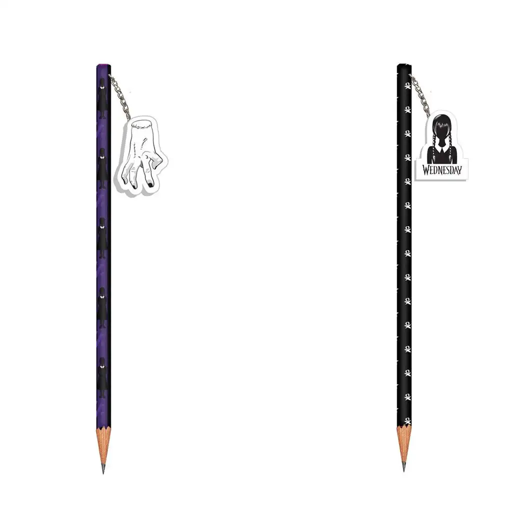 Surprinde-ți copilul fan Wednesday cu un instrument de scris cu adevărat unic și cool! Creionul cu grafit Wednesday, dotat cu radieră, nu este doar un accesoriu practic pentru școală, ci și o adevărată declarație de stil. Este disponibil în două variante: unul dintre creioane este decorat cu misteriosul și iconic „Thing” (mâna), iar pe celălalt apare chiar Wednesday Addams – bineînțeles, în stilul ei sumbru cunoscut, cu motive de craniu.