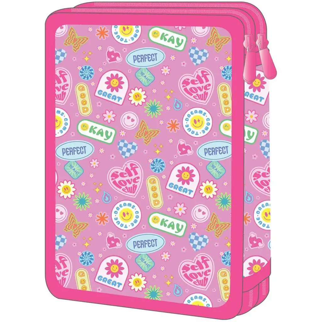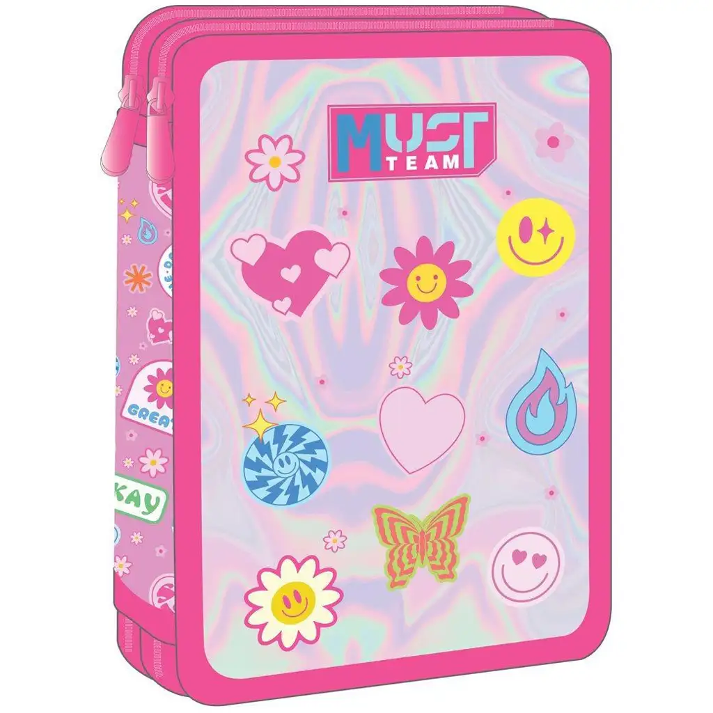 Penarul cu două niveluri, deja echipat, Must Team Good Vibes este alegerea perfectă dacă vrei ca copilul tău să fie mereu organizat și stylish la școală. Coperta cu efect holografic și iconițele colorate – cum ar fi soarele zâmbitor, inima, fluturele, flacăra și fața zâmbitoare – garantează o stare de bună dispoziție în fiecare dimineață. Designul este modern, proaspăt și plin de energie pozitivă – exact ce trebuie pentru o zi de școală.