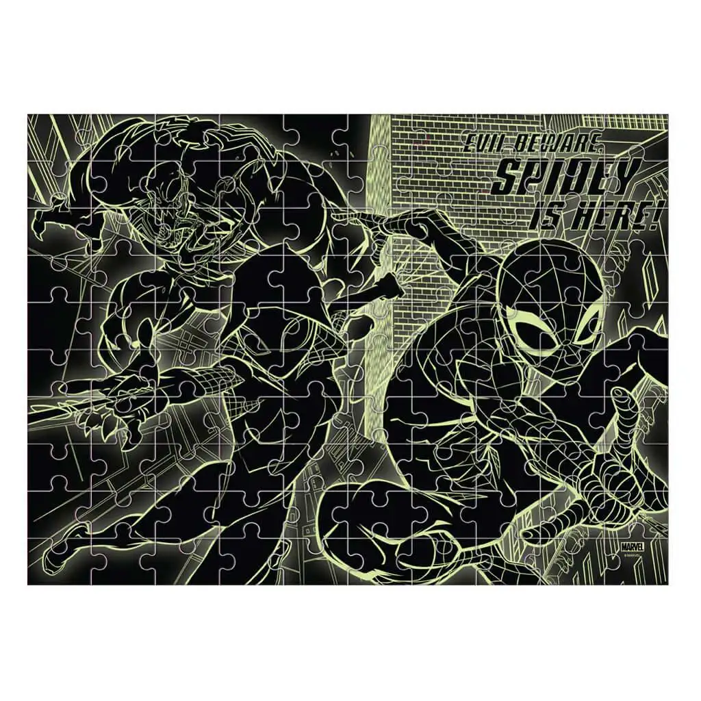 Acest puzzle de 100 de piese nu este doar spectaculos ziua, ci prinde viață și noaptea, deoarece este imprimat cu vopsea fosforescentă, astfel încât, în întuneric, redă scenele pline de acțiune cu Omul-Păianjen și prietenii săi. Particularitatea puzzle-ului constă în faptul că îmbină două funcții într-o singură cutie: copiii pot asambla mai întâi o scenă clasică, colorată, din universul Marvel cu Venom, Spider-Gwen și, bineînțeles, Omul-Păianjen, apoi, pe cealaltă parte, vor găsi o variantă de colorat care strălucește în întuneric. Această experiență 2 în 1 dezvoltă creativitatea, dexteritatea, răbdarea și percepția spațială, în timp ce copiii se cufundă în lumea supereroului lor preferat.