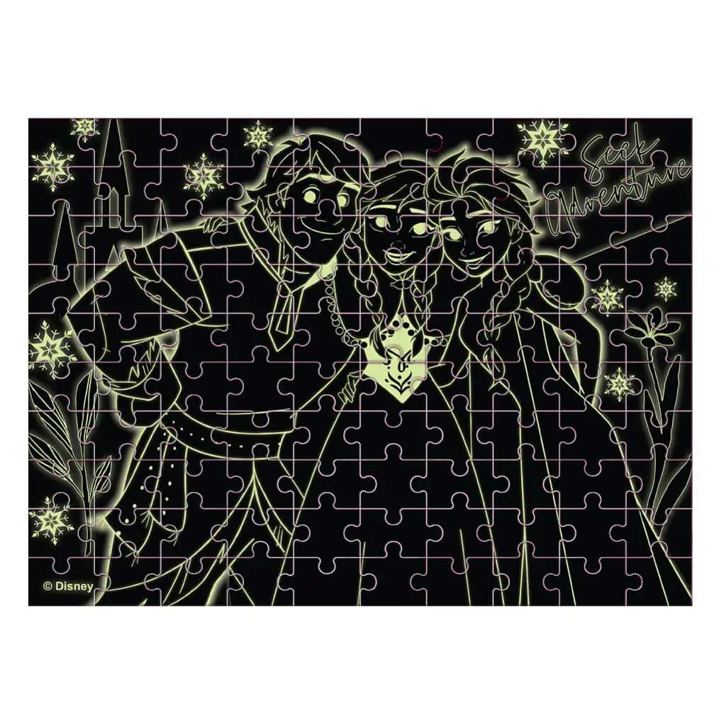Acest puzzle Frozen cu 100 de piese nu ascunde doar o imagine colorată, ci prinde viață și în întuneric datorită modelelor sale fosforescente, oferind o experiență interesantă atât ziua, cât și noaptea.