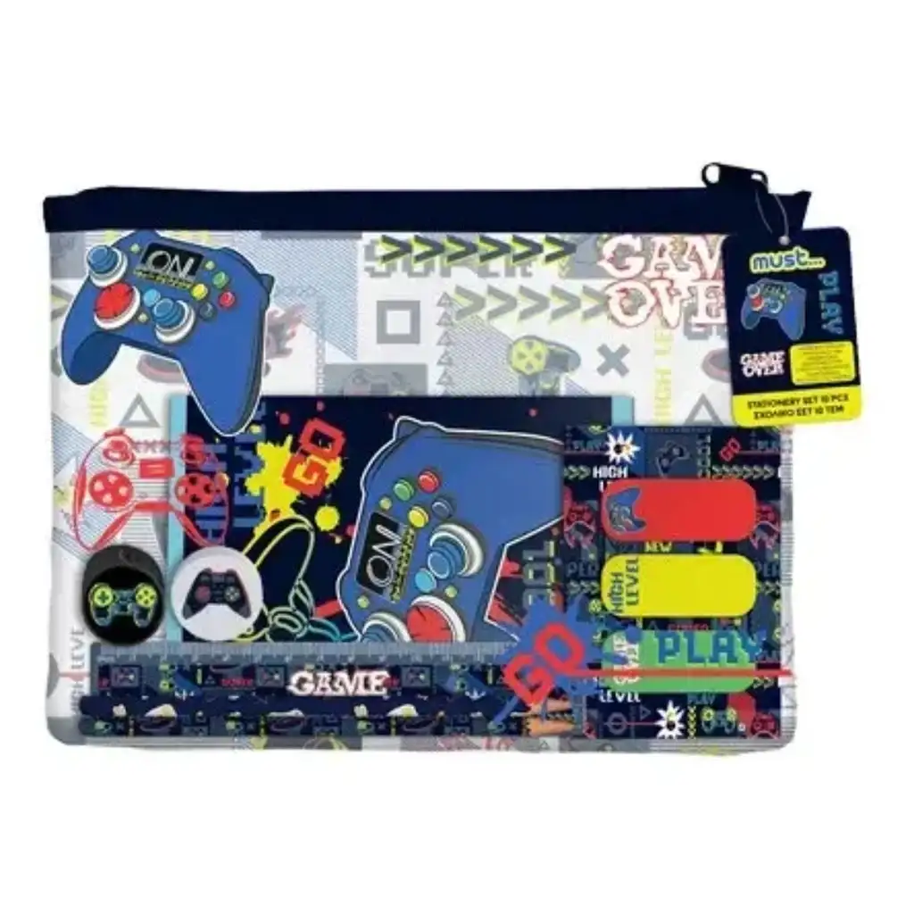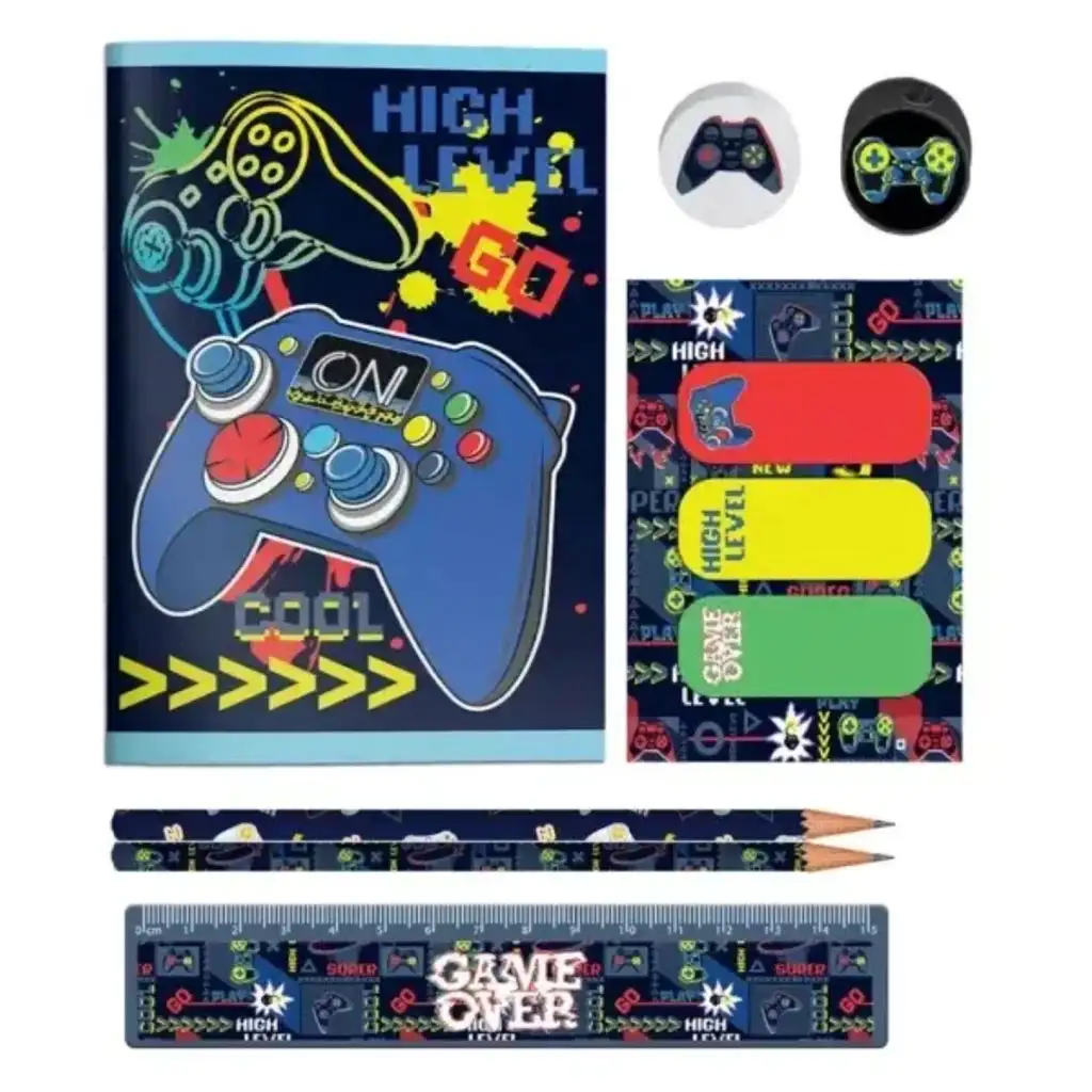 Setul conține un caiet mic, două creioane grafit, o riglă, o gumă de șters, o ascuțitoare și trei semne de carte colorate, toate acestea fiind organizate într-o husă rezistentă, cu fermoar. Husa încape ușor în ghiozdan, astfel încât toate lucrurile importante vor fi mereu la îndemână. Designul de bază în culori închise, cu motive neon și grafici cu controllere, oferă un efect cu adevărat cool – îl va adora!