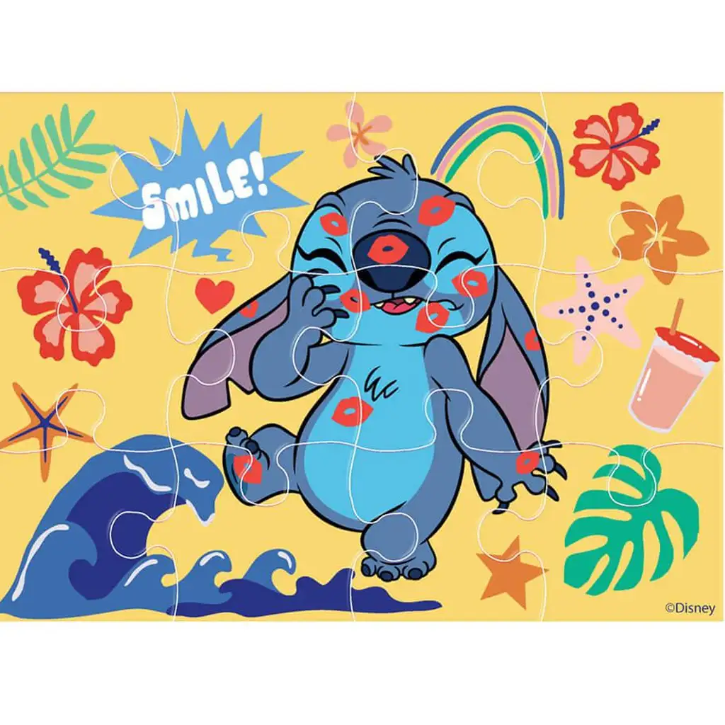 În cutie se găsesc patru puzzle-uri diferite: unul cu 12 piese, unul cu 15, unul cu 20 și unul cu 24 de piese. Această varietate ajută excelent la dezvoltarea motricității fine, a recunoașterii formelor și a concentrării, încă de la vârsta de 3 ani. Culorile vii ale puzzle-urilor, atmosfera tropicală și zâmbetul drăguț al lui Stitch cu siguranță vor captiva atenția copiilor.