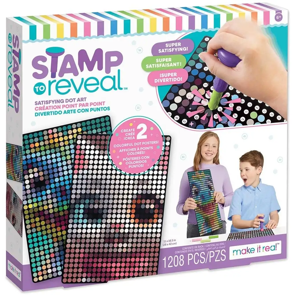 Descoperă magia artei cu puncte cu setul Make It Real 2 în 1 Kit de Timbre cu Stickere cu Puncte, cu ajutorul căruia copiii pot realiza două postere cu adevărat drăguțe și interesante: imaginea unei pisicuțe fermecătoare și a unui dinozaur colorat prind viață punct cu punct! Cu ajutorul șabloanelor numerotate, punctele sunt așezate cu ușurință la locul potrivit, garantând succesul încă de la prima creație.