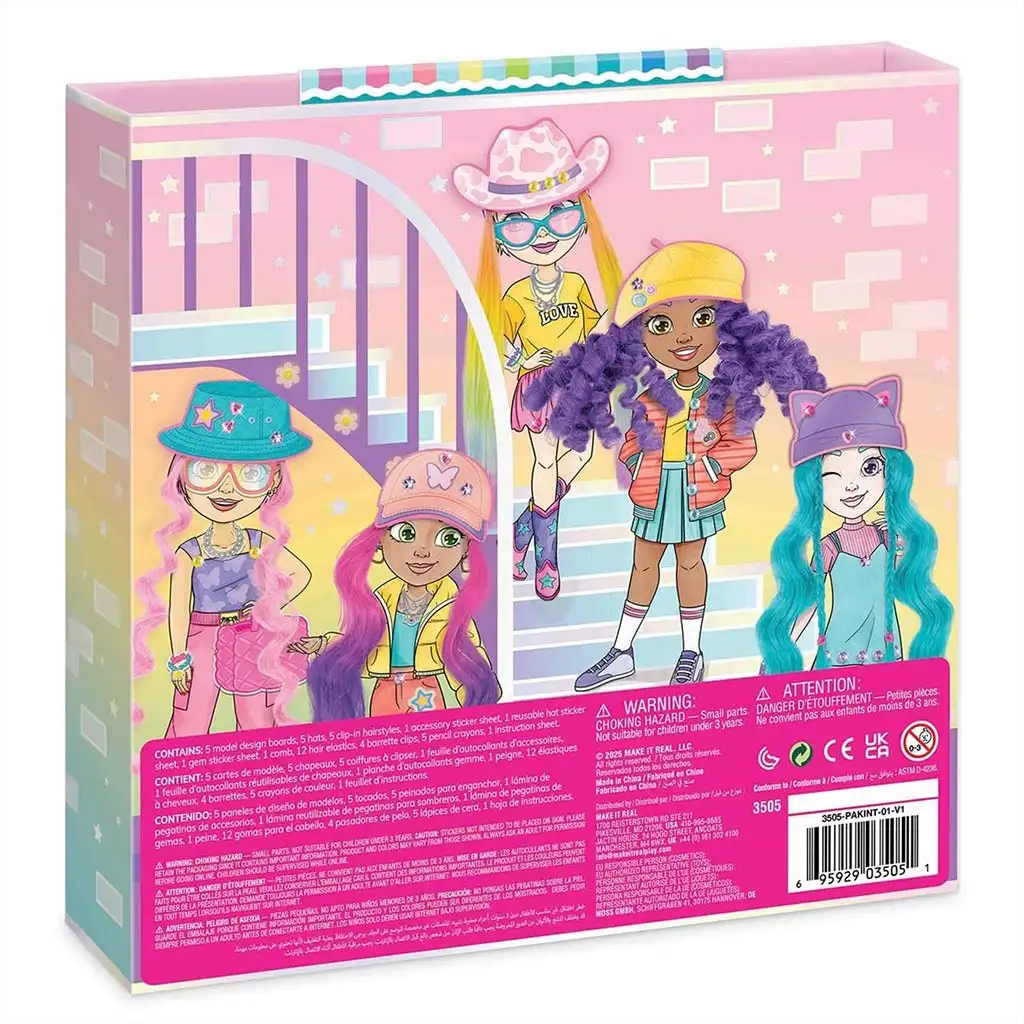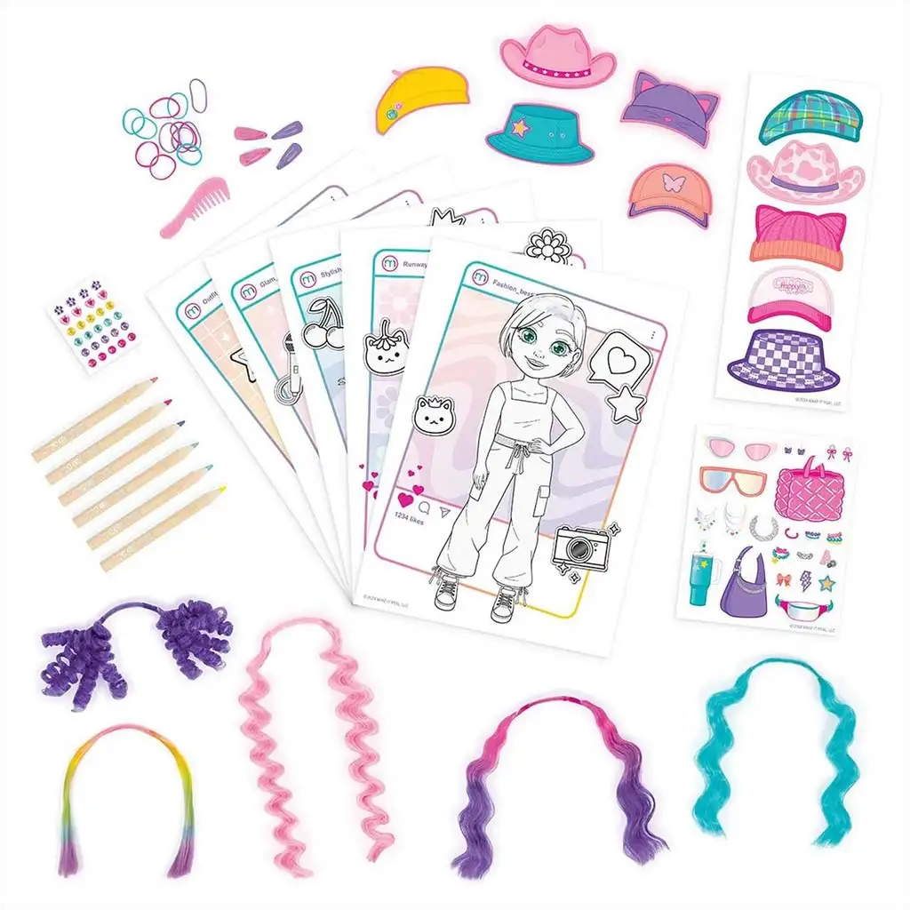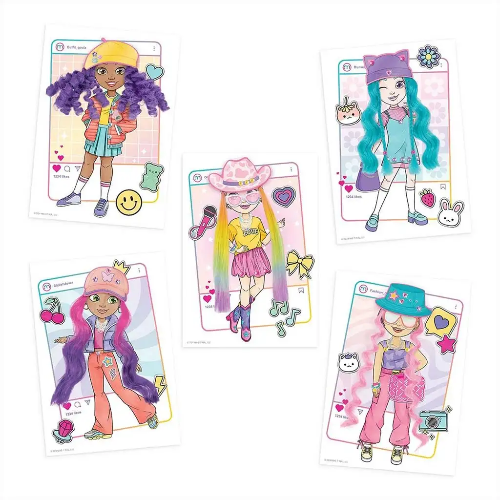 Setul conține 5 foi de modele diferite ce pot fi personalizate cu creioanele colorate, abțibildurile și accesoriile incluse. Experiența cu adevărat specială este oferită de șuvițele colorate interschimbabile, care se pot atașa personajelor, astfel încât pot fi încercate coafuri complet noi. Cu ajutorul pălăriilor, ochelarilor de soare, genților și altor accesorii, fiecare creație poate avea un alt stil – de la sportiv la boem sau chiar extravagant.